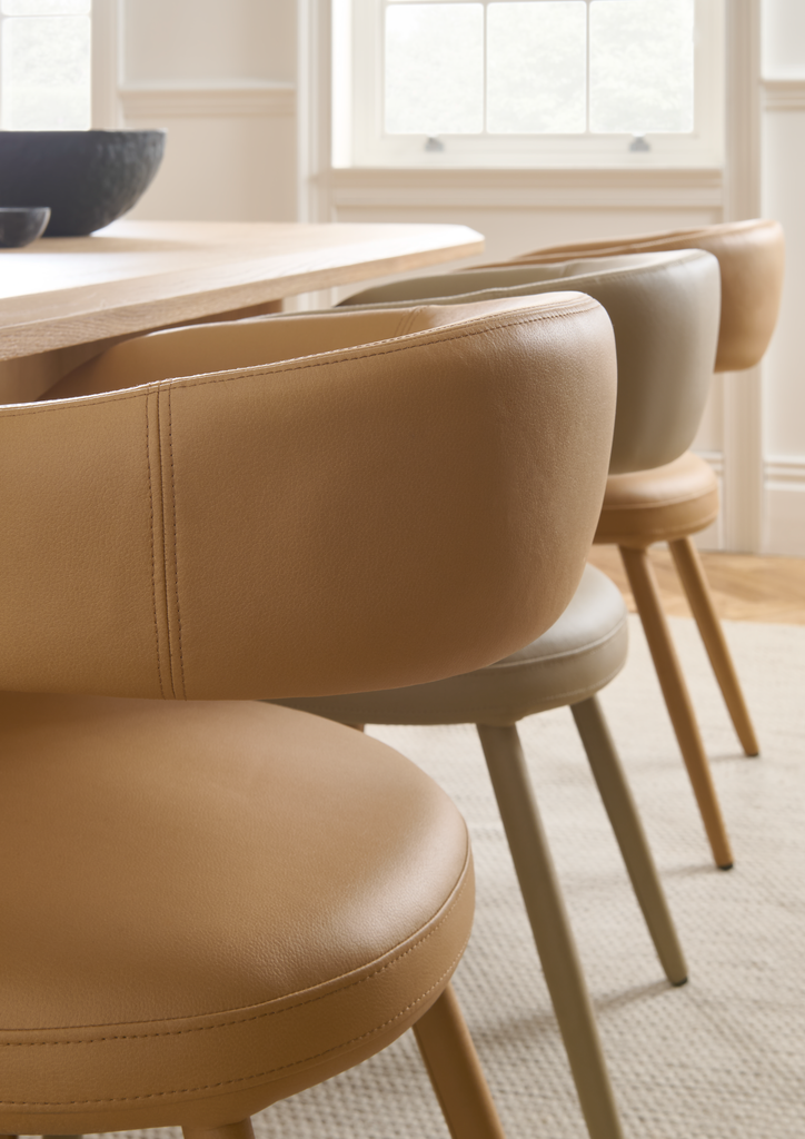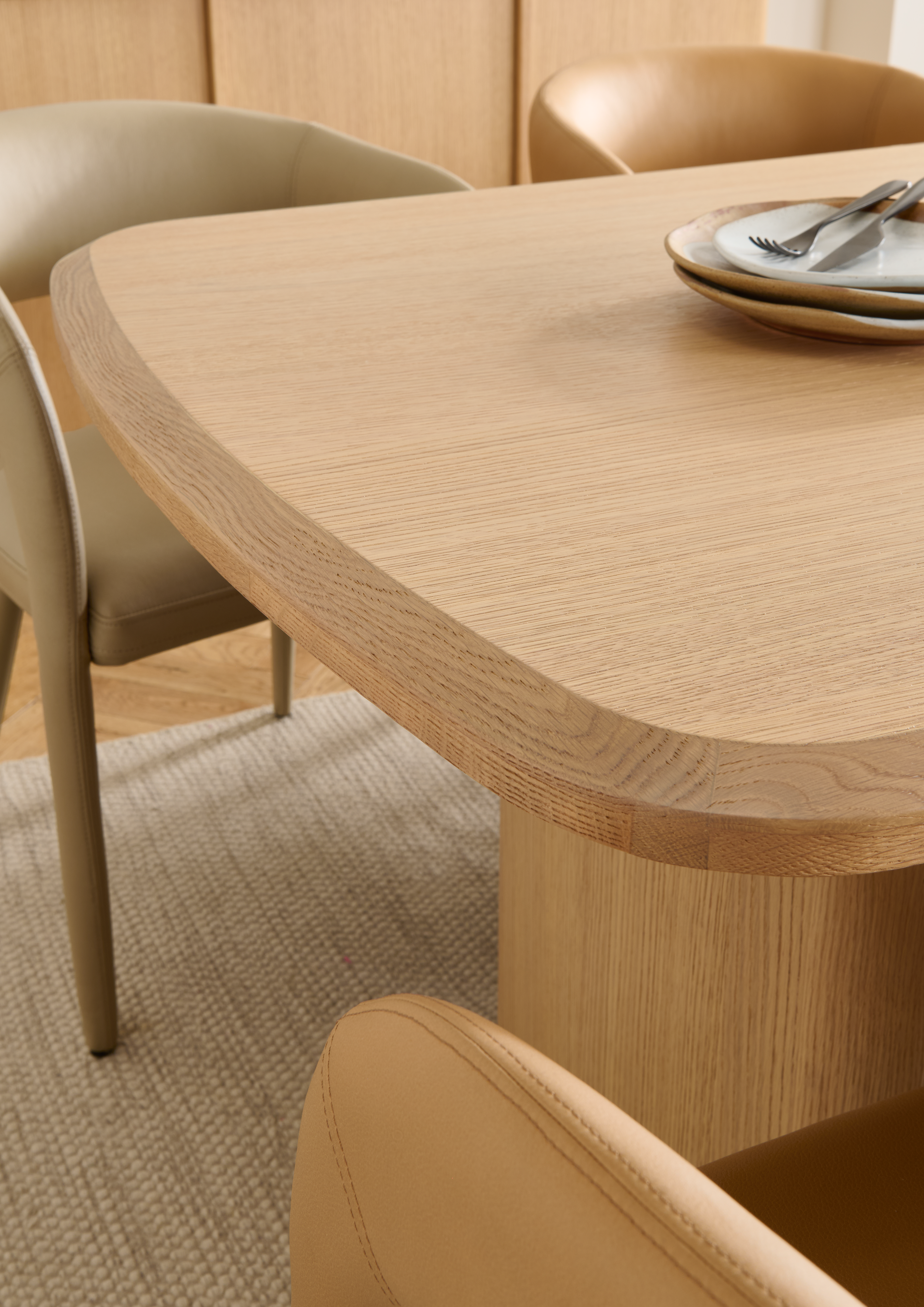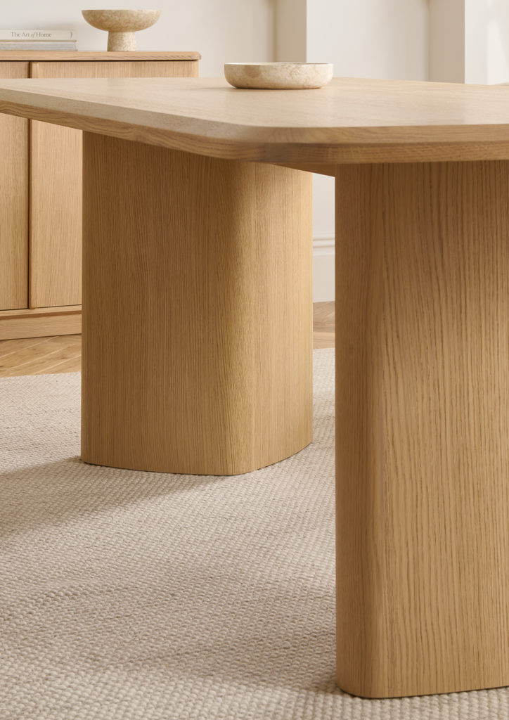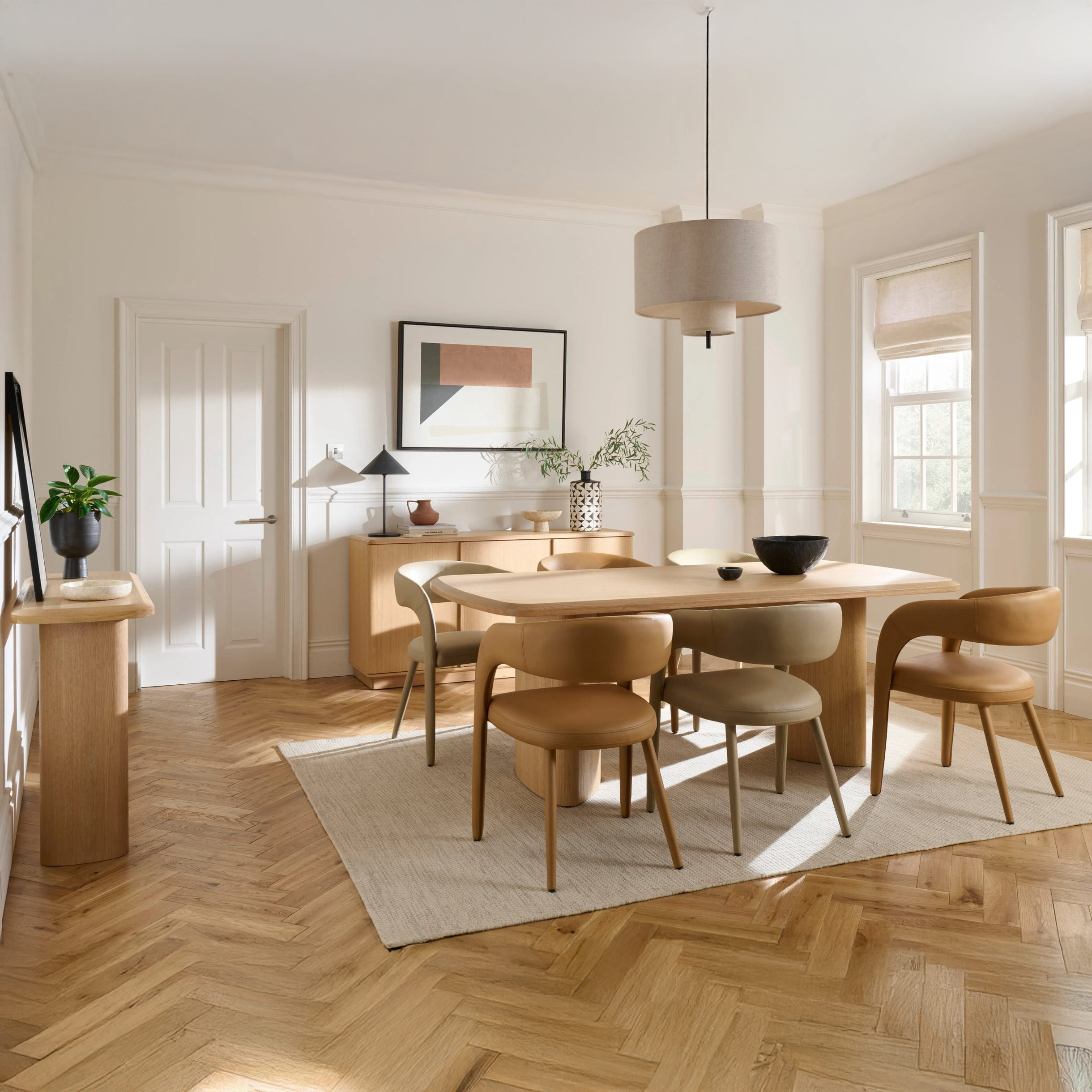 From the generous dining table supported by curved pillar legs to the streamlined sideboard with hidden storage and thoughtfully crafted drawers, the range balances form and function in every detail. Coordinating dining chairs, available in soft neutral upholstery, offer exceptional comfort with wraparound backs and subtly cushioned seats.