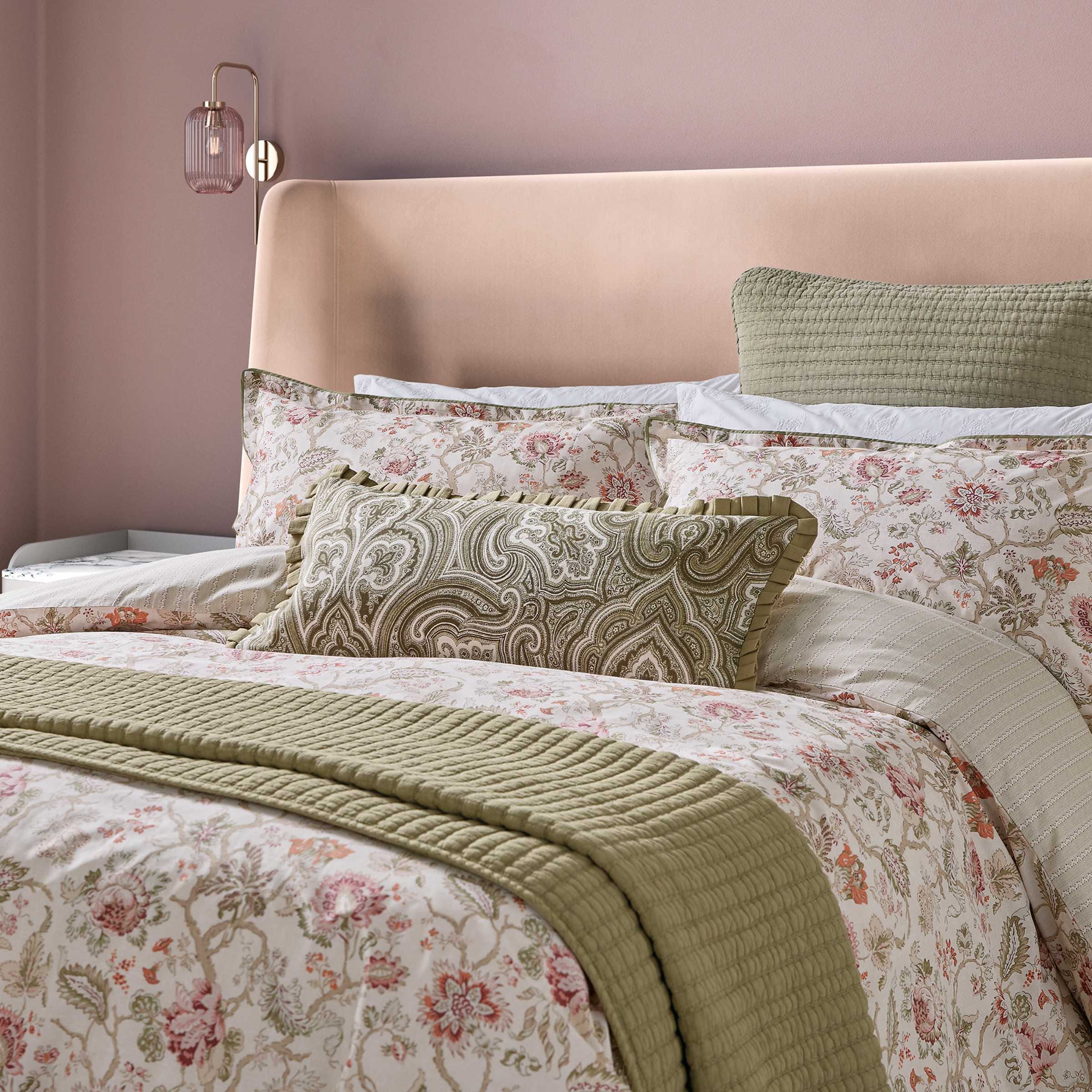 An exquisite printed floral design with an eloquent vintage feel in hues of sage green and tuberose. Beautifully complemented with the sage green stone washed quilted sham, standard pillowcase in white with all-over embroidered detailing and paisley print cushion, complete with pleats on all four sides.