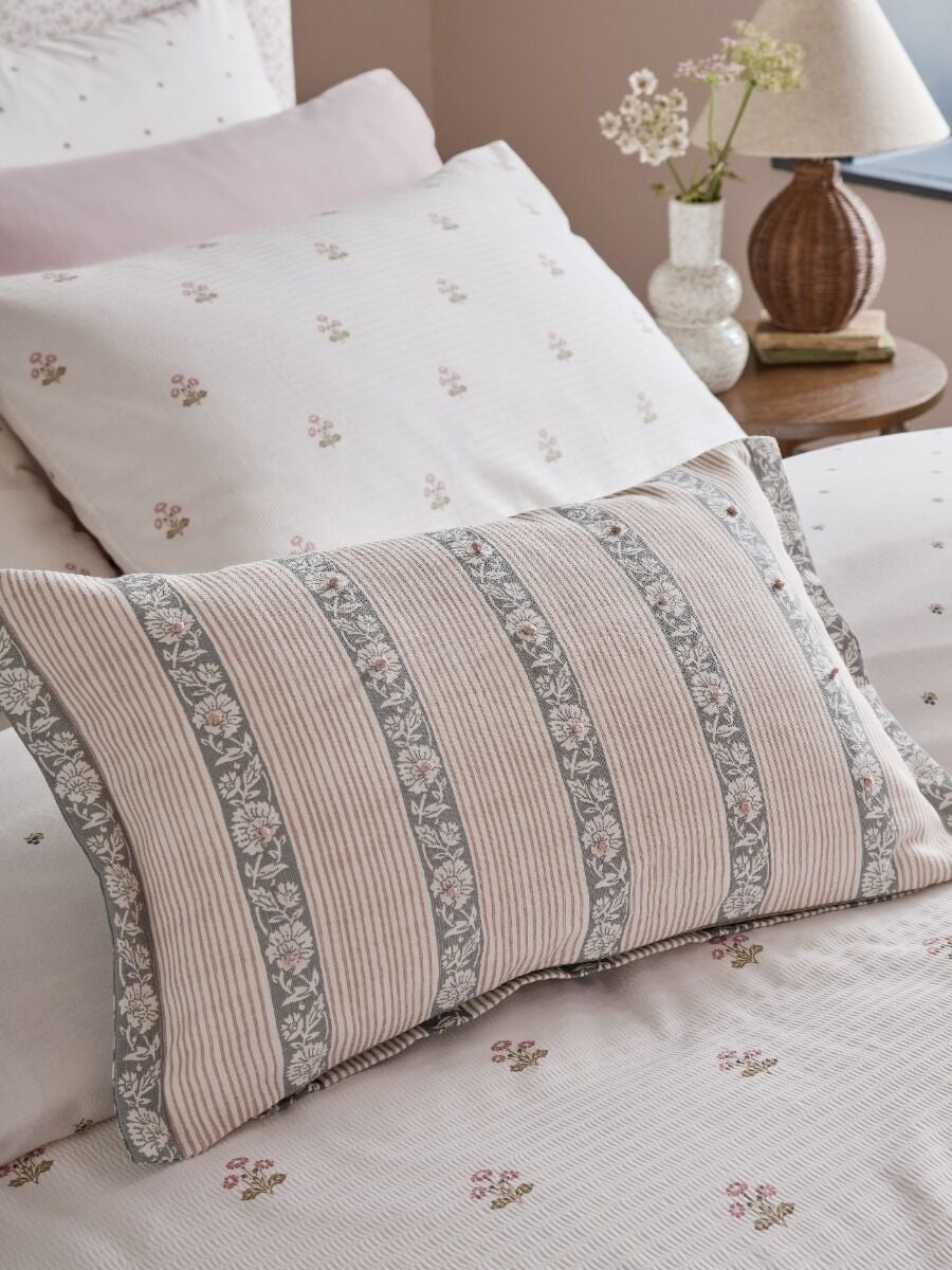 Elevate your home with the new Semington printed cushion. Featuring a beautiful, block print style design on a cotton base, this cushion is enhanced with delicate French knot embroidery and a mock oxford edge, that adds rich texture and a touch of handcrafted charm. The reversible cushion is available in a sophisticated sage green and natural pallet. Filled with a luxury fine denier micro fibre “Feels like Feather” pad.