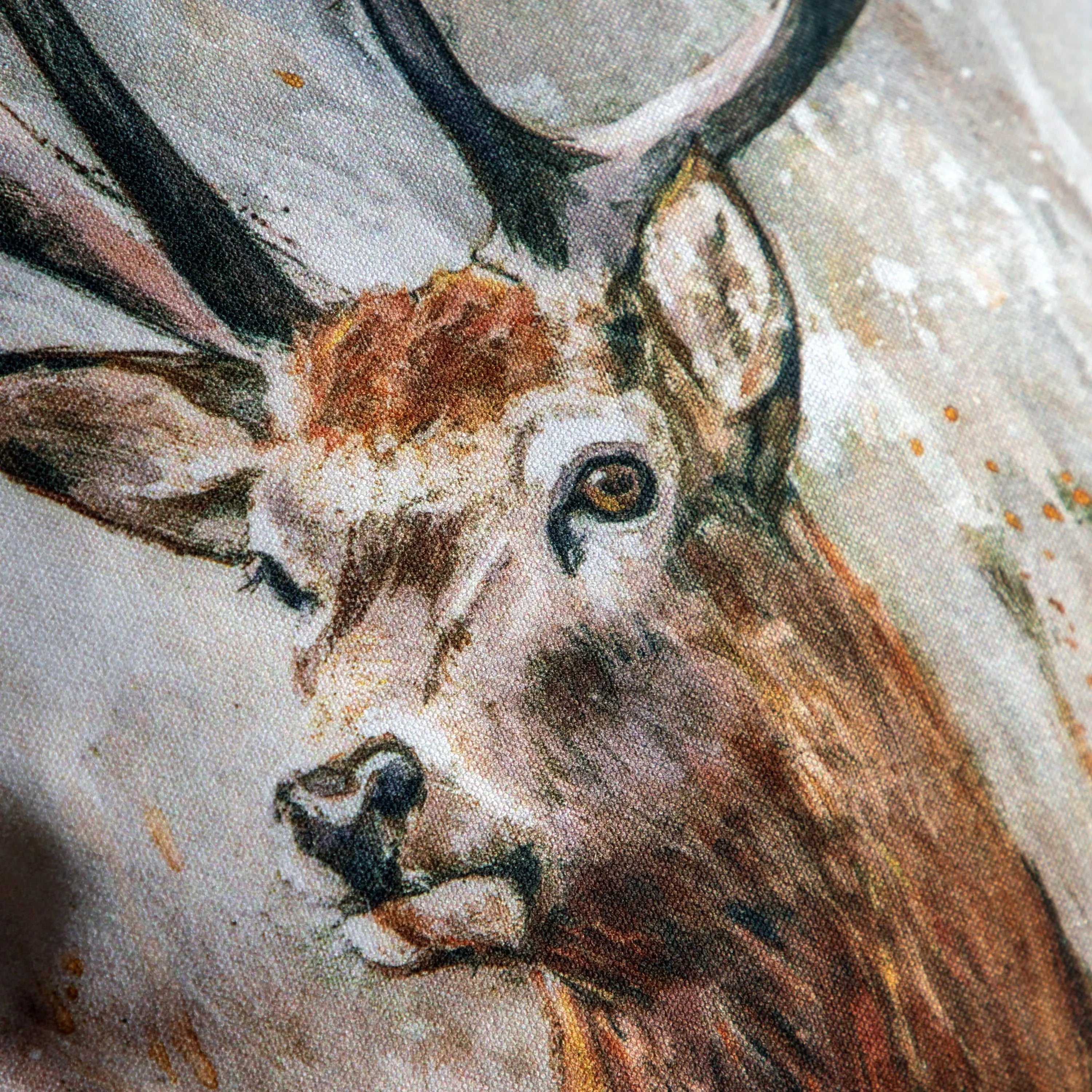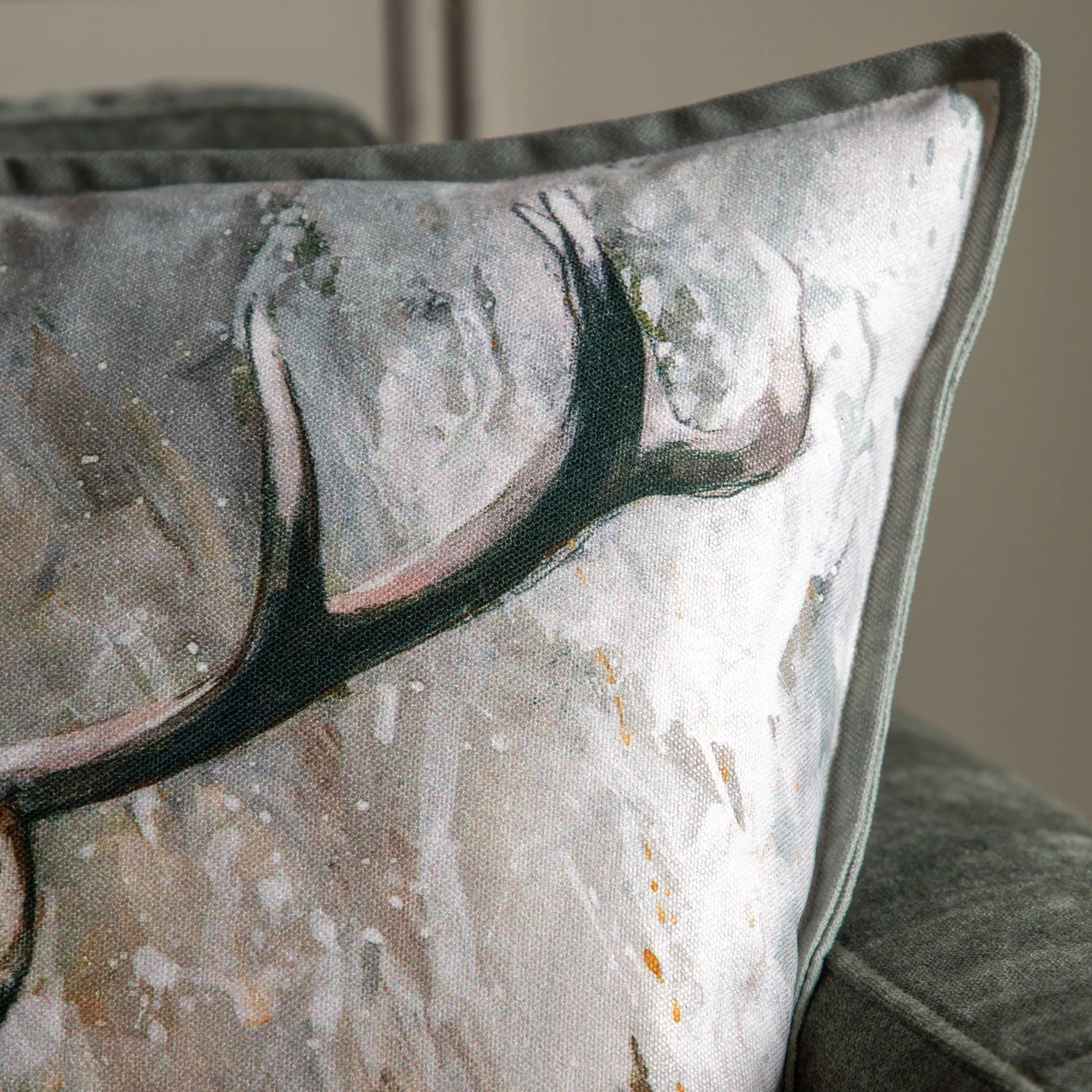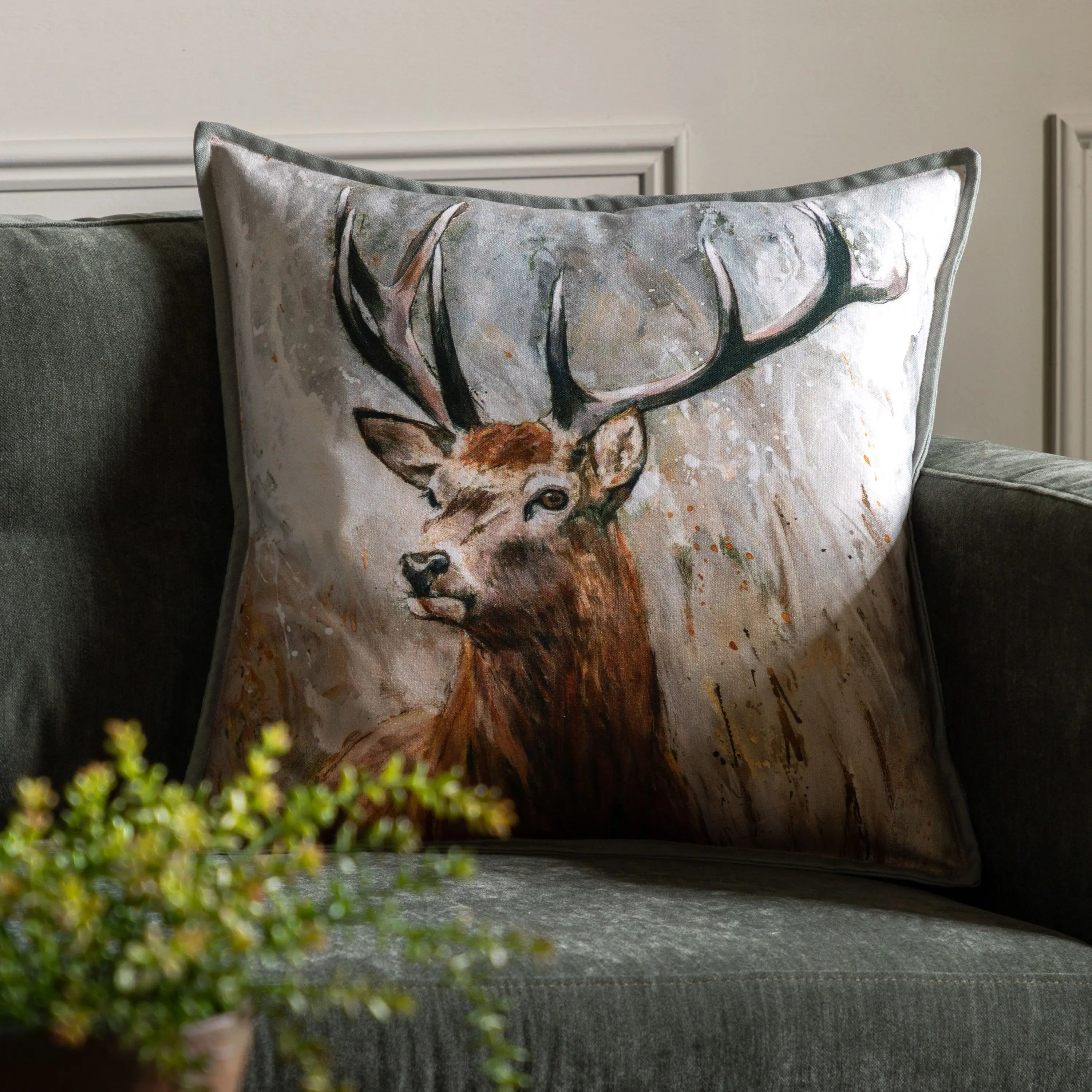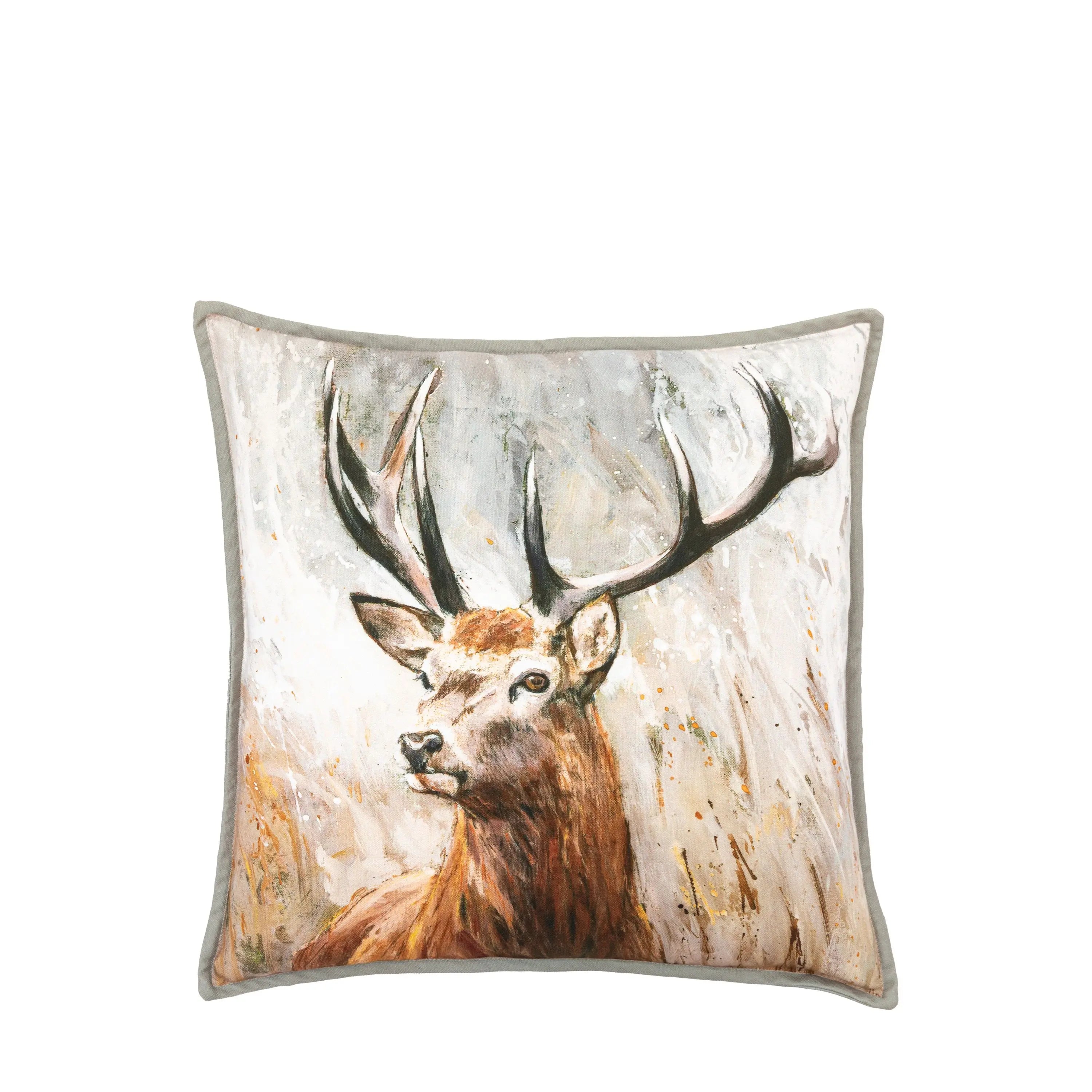 Beautifully finished with an elegant mini flange edge, this cushion features a delicate watercolour stag design perfect for adding a refined country aesthetic to any living space.