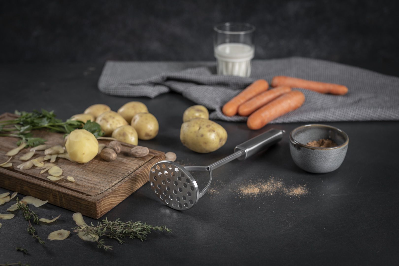 The potato masher from Kuhn Rikon’s stylish ESSENTIAL collection will enable you to conjure up mashed potato par excellence. The perfectly dimensioned holes in the front section of the grater mash your potatoes down effortlessly to produce the perfect mash – or a base for dumplings. Last but not least, the flat, round design makes this an elegant eye-catcher in any and every kitchen.