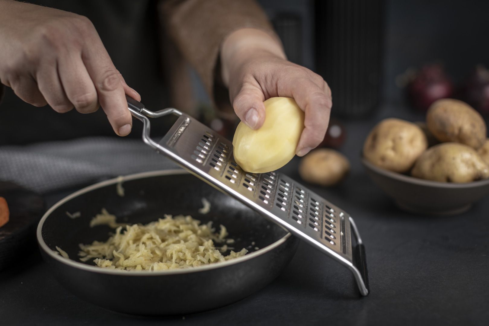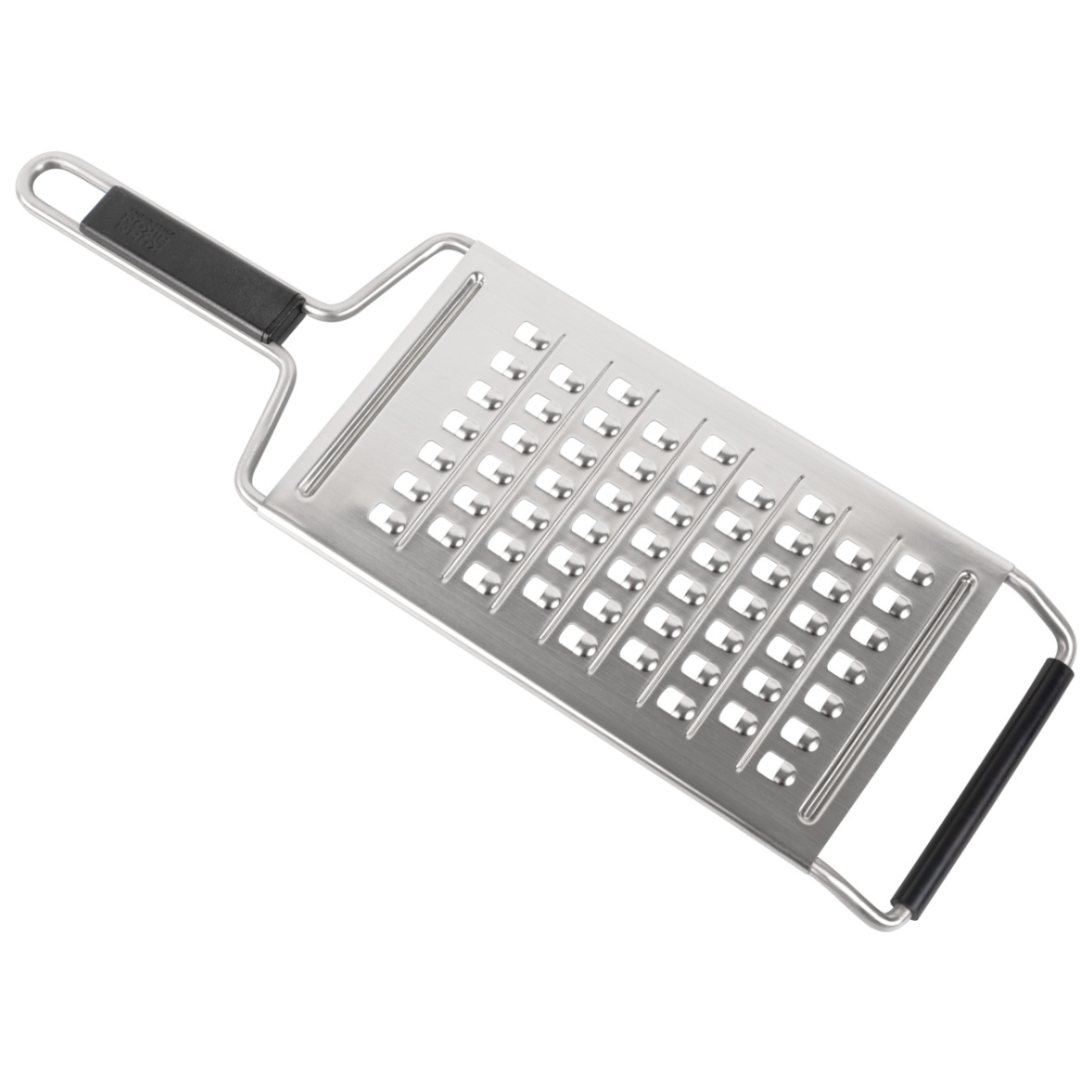 The coarse all-purpose grater from Kuhn Rikon’s ESSENTIAL collection allows you to effortlessly grate potatoes, carrots, courgettes and much more. Minimum effort produces maximum results for successful and delicious dishes. Instead of mauling food around, the razor-sharp blade delivers a clean slice with unerring precision. Thanks to its optimised design, the grater is comfortable to hold and takes up very little cupboard space.