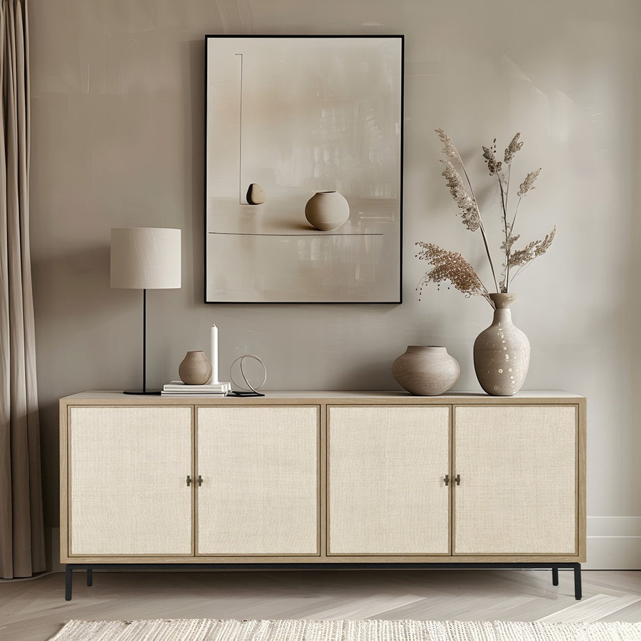 Scandinavian simplicity meets mid-century modern design, with soft tones, bleached wood finishes, and functional yet beautiful forms that evoke calmness and cosiness.