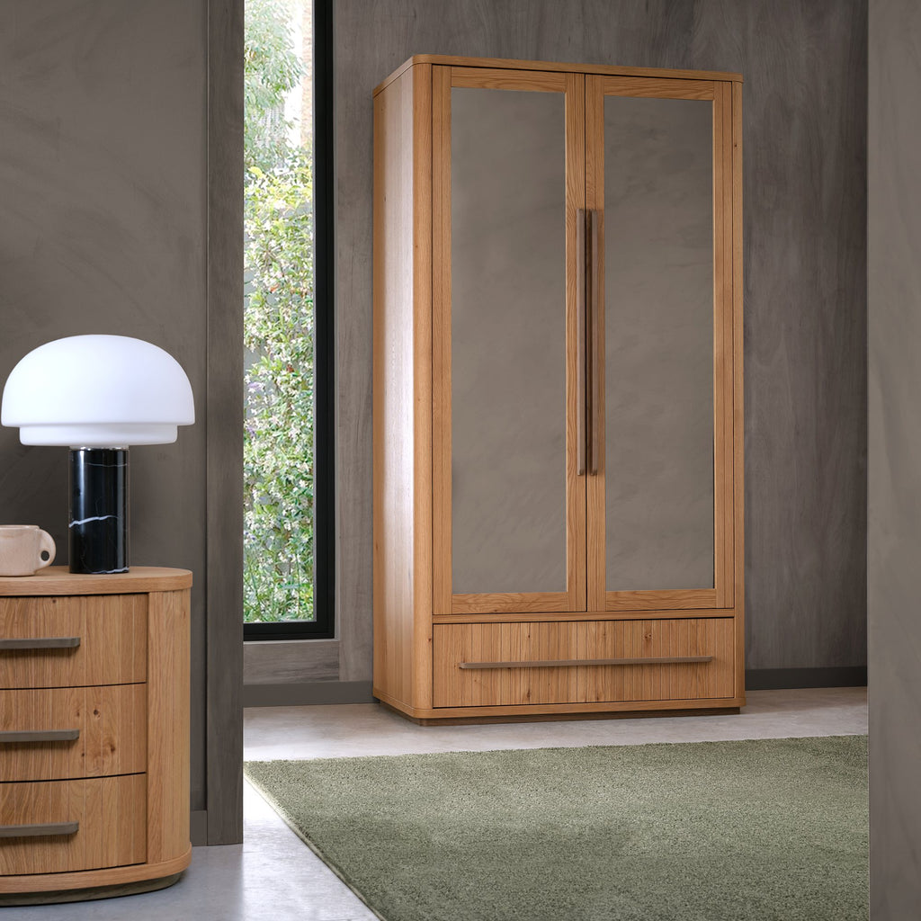 Stool options reflect the crafted aesthetic of the range. The upholstered version picks up on the turned-leg detail of the bed frame, while the cylindrical design offers concealed storage in a compact, versatile form. Completing the room, the Double Wardrobe features mirrored doors and a deep lower drawer, bringing together practicality and a cohesive visual finish. Defined by sculptural lines, layered materials and considered proportions, Nova offers a bedroom setting that is expressive, grounded and beautifully resolved.
