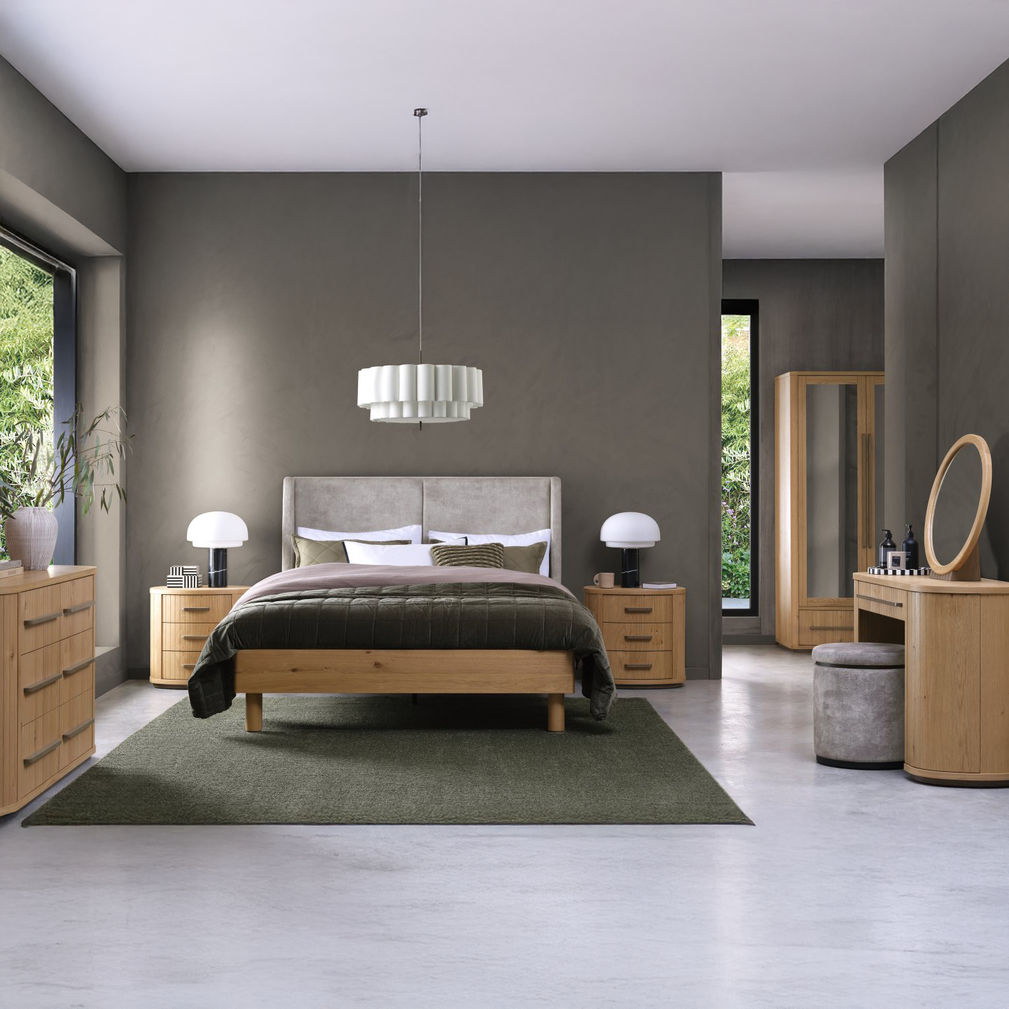 The Nova bedroom range brings a sense of crafted character to contemporary spaces, combining knotty oak veneers with a soft weathered finish and expressive grain. At its centre, the bed frame sets a confident tone with turned oak legs and a pearl crushed velvet headboard that introduces texture and contrast. Curved profiles and subtle grove detailing run throughout the range, lending cohesion and balance to each piece. Generous drawer storage is provided through softly contoured chests and elliptical nightstands, available in both three-drawer and open-shelf variations to suit a variety of room layouts and lifestyles. The Dressing Table pairs a central drawer with shelving concealed behind its pillar-like sides, offering a streamlined look with functional detail.