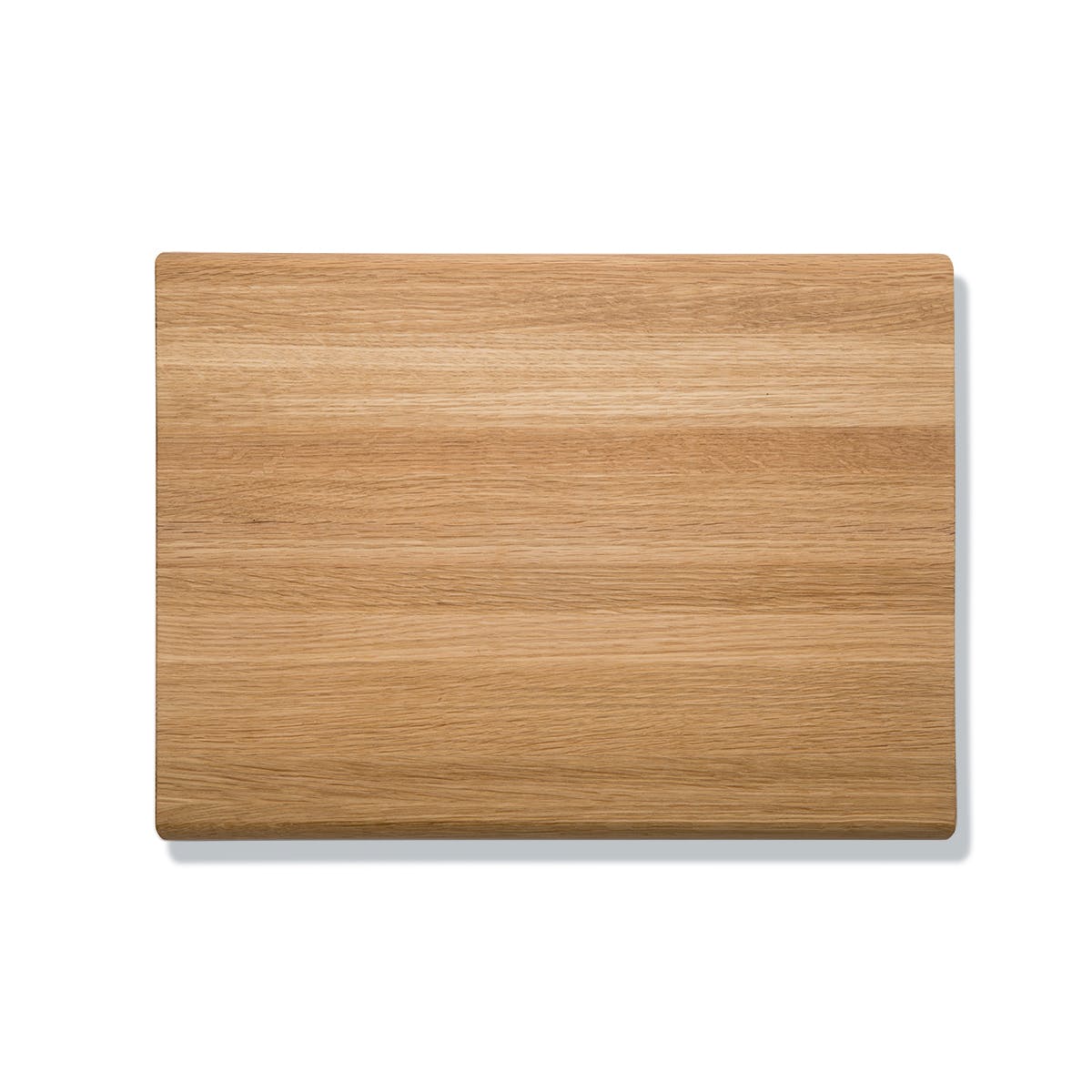A 38cm rectangular wooden edge grain chopping board with natural grains which protect kitchen knives whilst preparing food. Made from solid oak wood and features a food safe oiled finish.