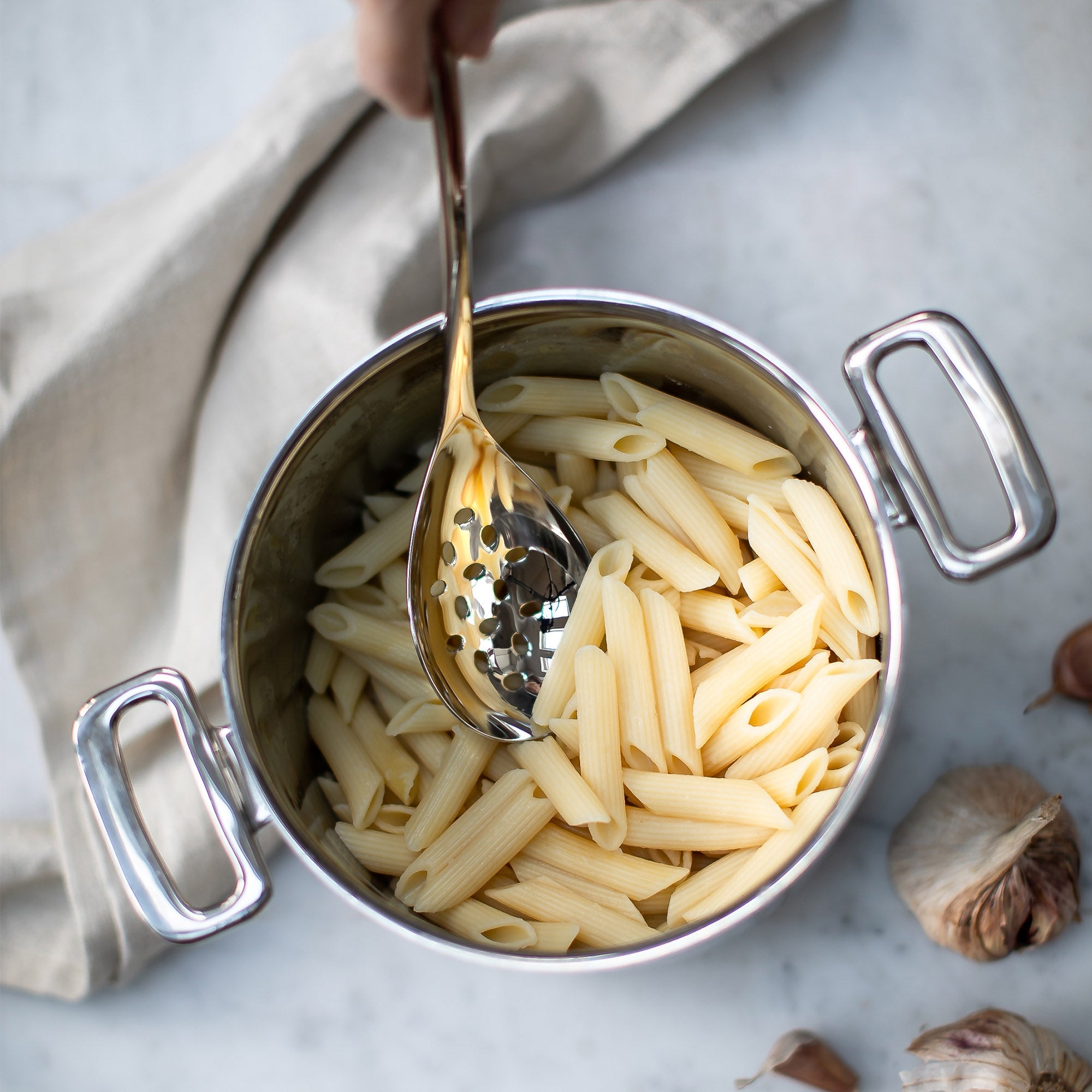 Ideal as a hanging set as well as serving pieces at the table. The utensils offer kitchen-to-dining functionality. The solid, cast stainless-steel pieces are elegant, timeless, mirror polished, and look elegant beside any of our cutlery ranges as serving pieces on the dining table. The design of the soft, curved ‘hook’, allowing the Signature utensils to hang from almost anywhere, also creates a stable point of contact, meaning that the utensil doesn’t rock when placed on a surface.