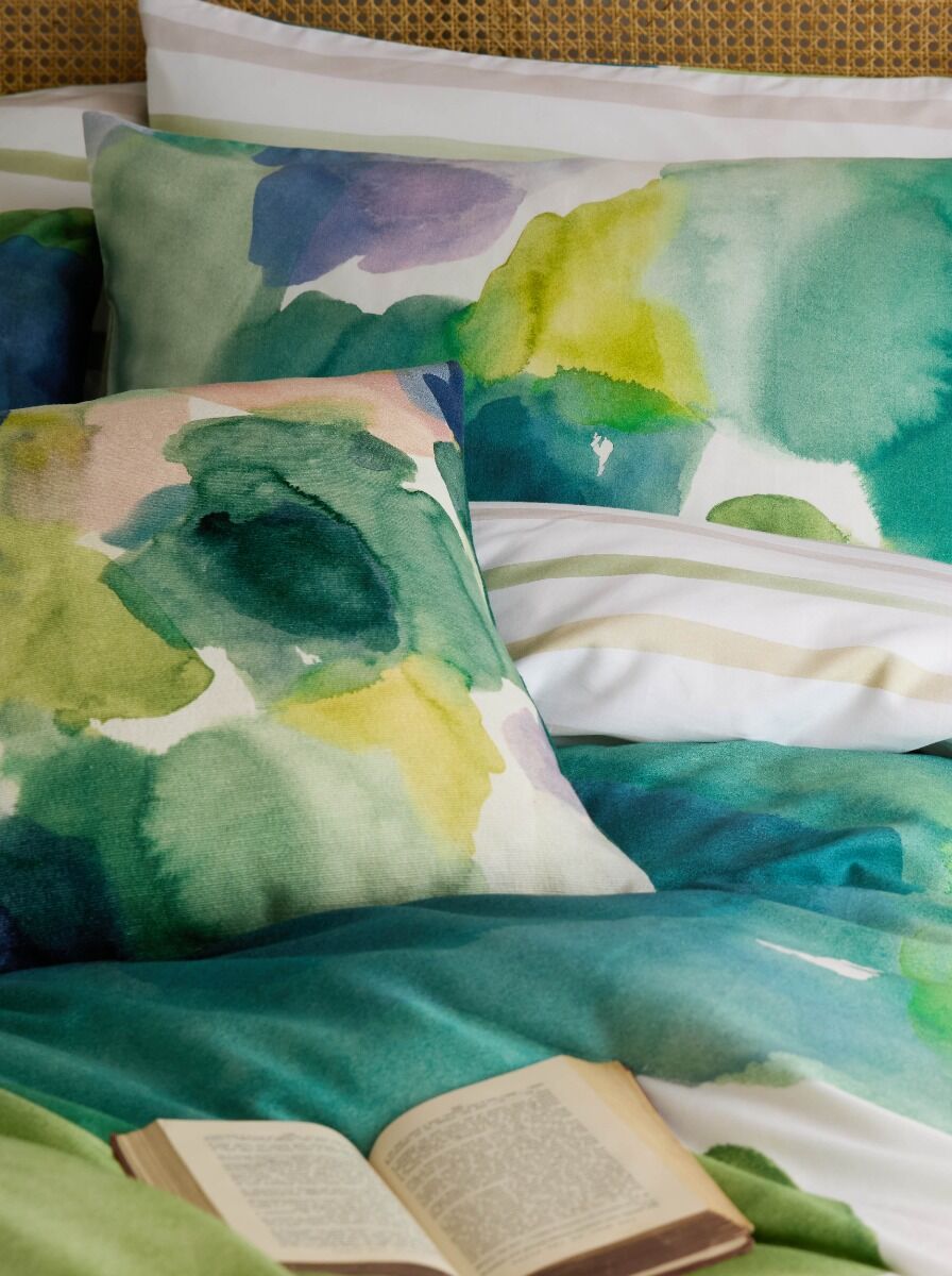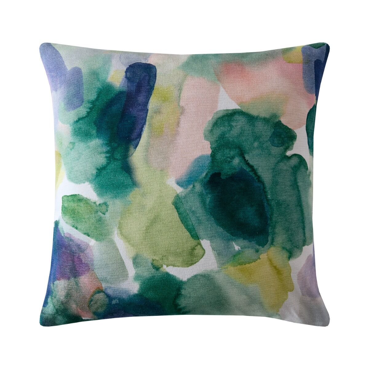 The stunning Lochaber cushion features a wash of watercolour marks which blend in a sophisticated palette of greens, blues and softly toned pinks with a hint of purple. This relaxing, muted palette is inspired by the vivid, verdant greenery found in Lochaber, nestled in the Scottish Highlands. Printed onto a natural 100% cotton ground with beautiful teal blue reverse, the perfect cushion to bring joy and colour to your home. This cushion will add a dramatic statement of colour to your home. This cushion is filled with a fine denier, recycled polyester cushion pad for a sustainable and luxurious feel.