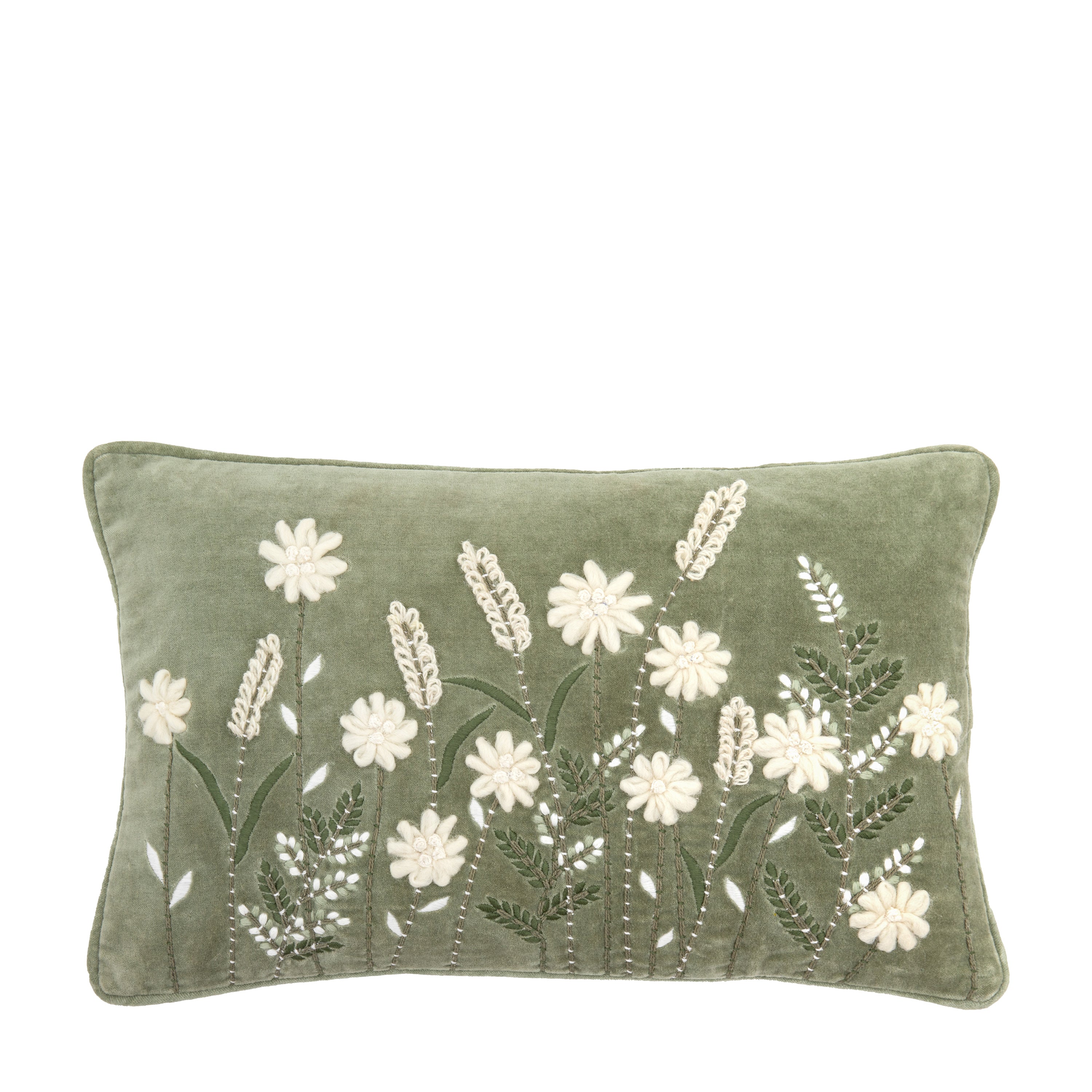 Velvet cushion in soft sage and cream tones with floral embroidery. Lovely accent cushion for living rooms, bedrooms and reading nooks.