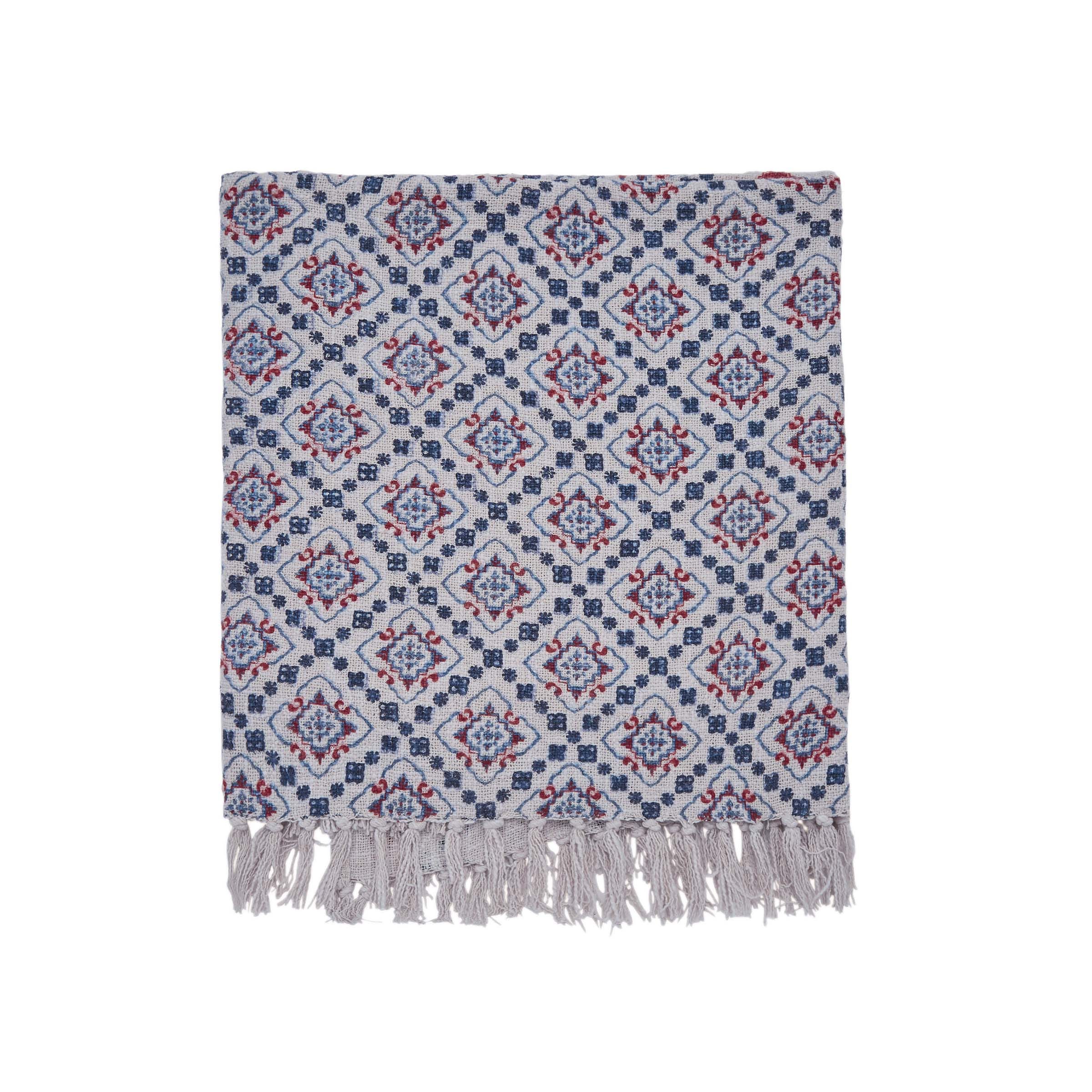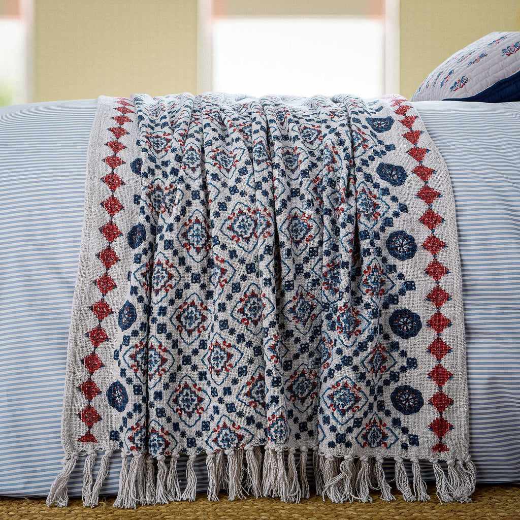 Both practical and decorative, incorporating throws into your home is an easy way to elevate any room. Adorned with an ornate tile-inspired print, this throw is designed to add texture and interest to bedding sets, but will also look beautiful draped over a sofa arm. It's made from 100% cotton and has a heavyweight construction making it the perfect accompaniment to those autumn and winter nights. A tied fringe trim to the top and bottom hem adds a traditional finish, while the palette of blue, red and creme will welcome a subtle touch of colour to your decor.