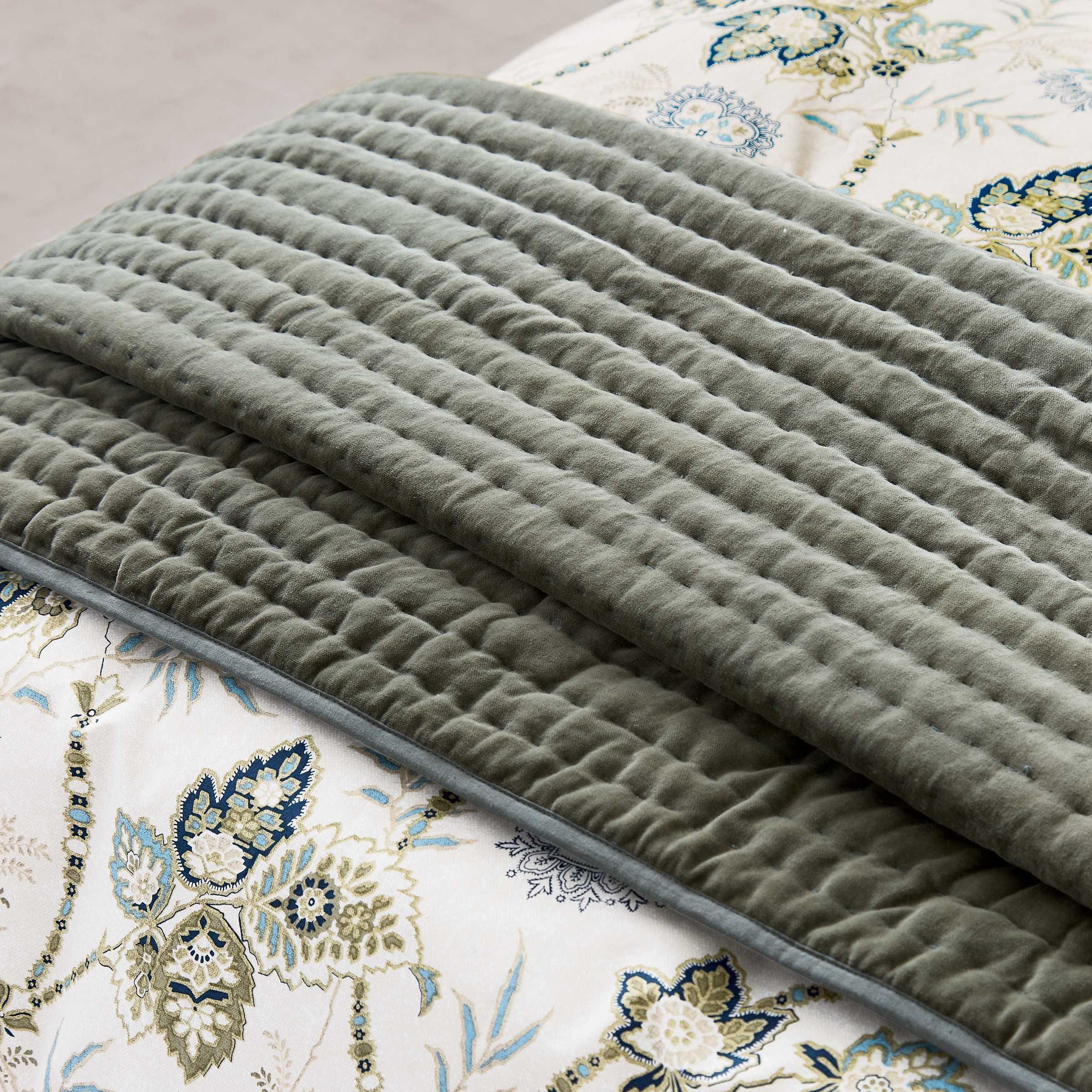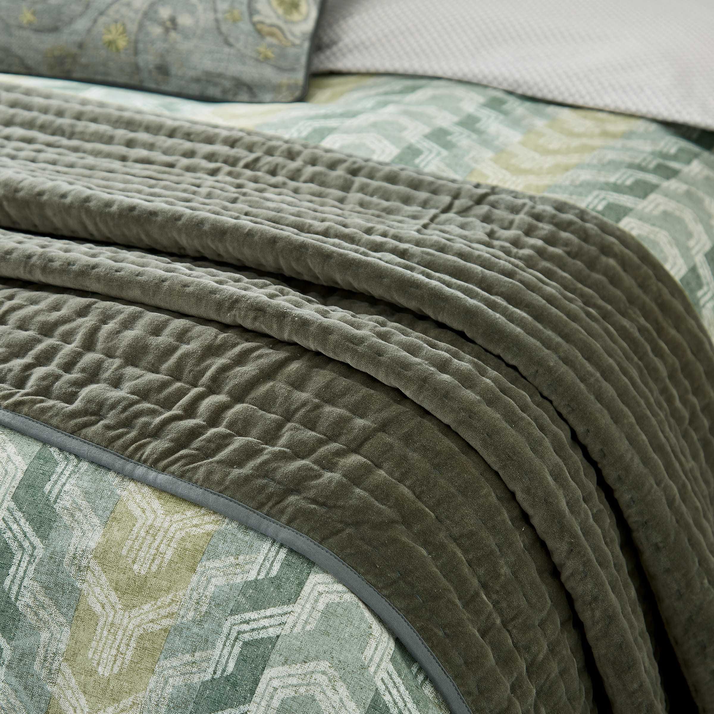 Tactile layers are introduced with the hand quilted green velvet throw, featuring a plain cotton reverse and bound edges.