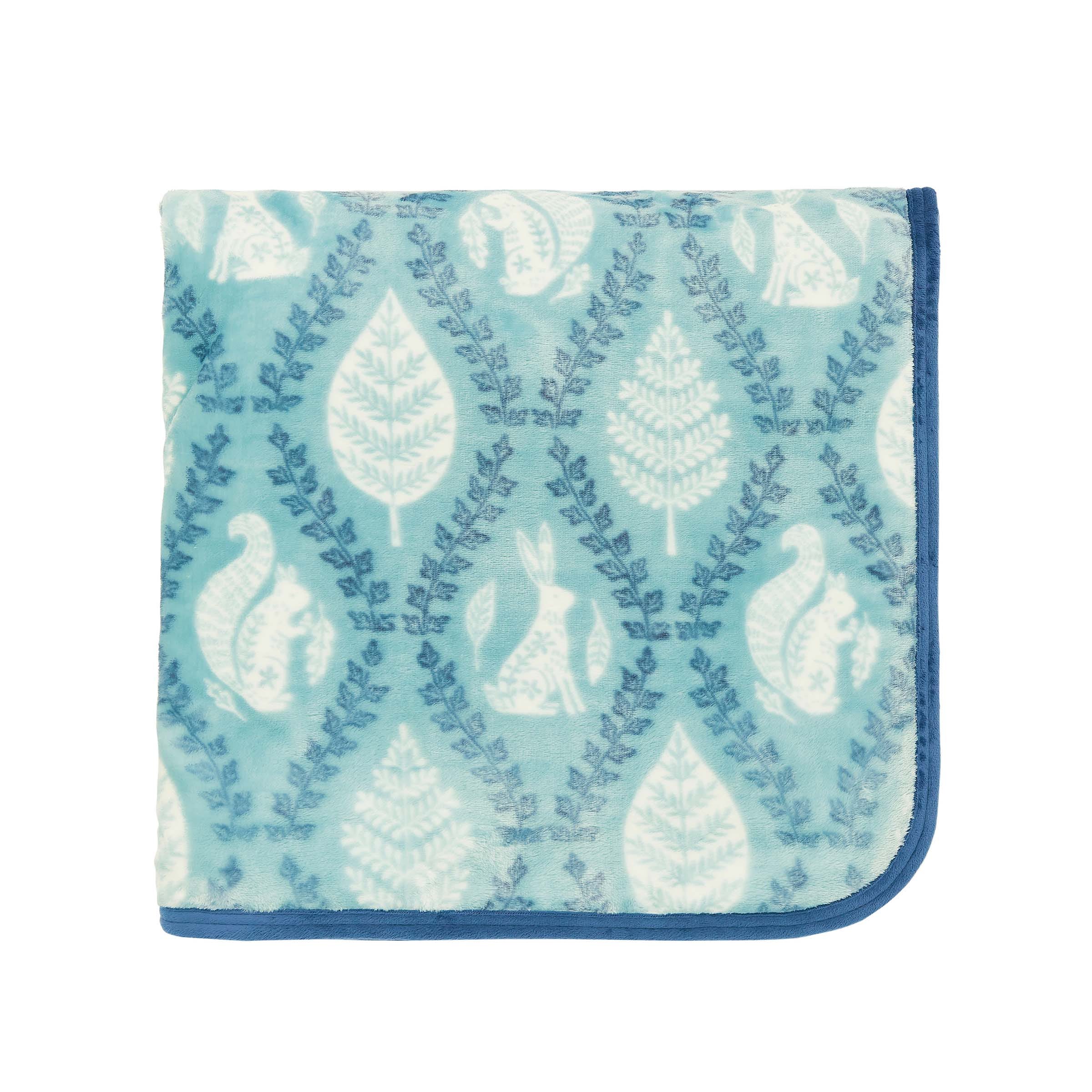 A leafy trellis surrounds naïve illustrations of animals and leaves in this soft, fleecy throw (140 x 180cms) which is edged with a navy binding.