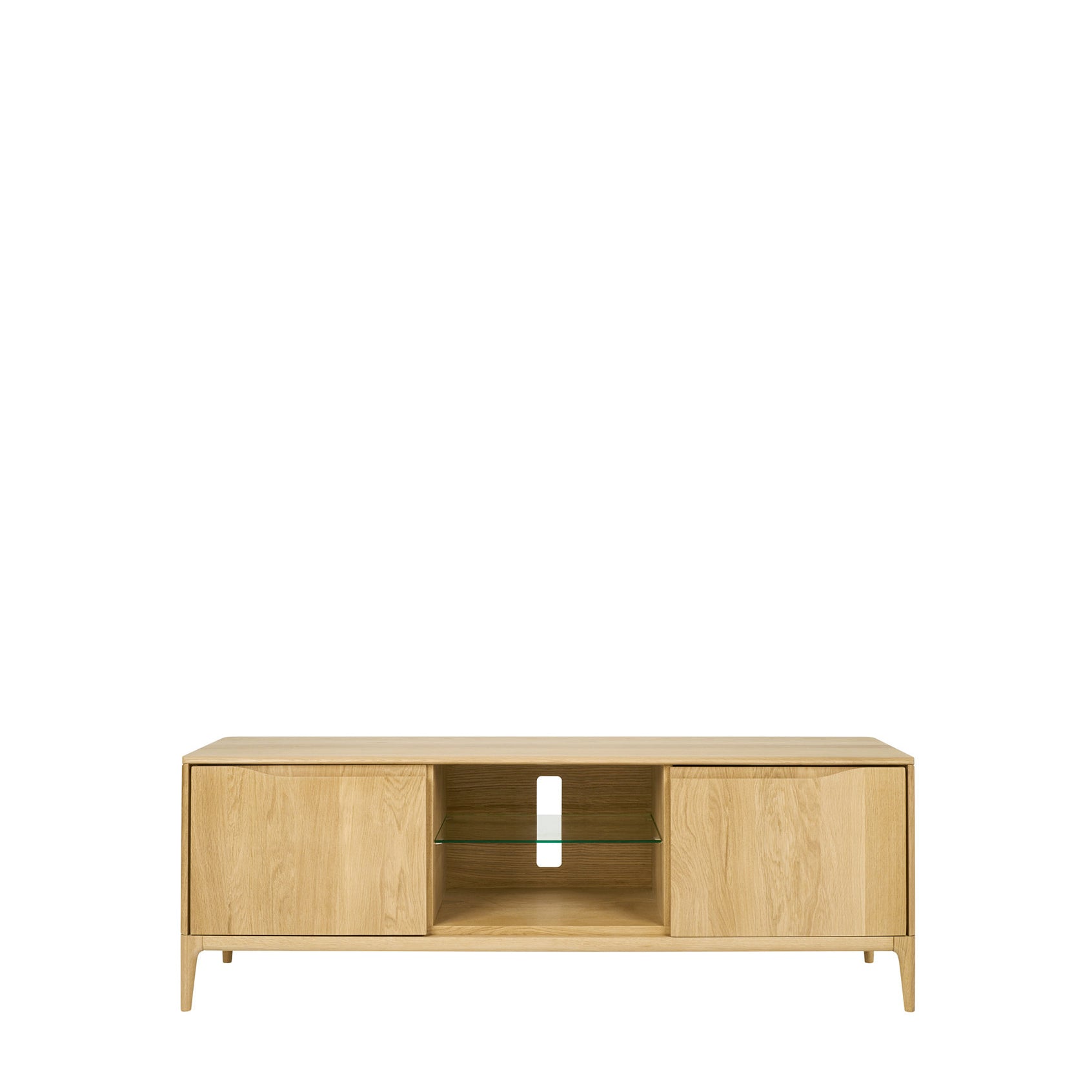 The Open Wide TV Unit features two cupboards for storing digital boxes out of sight, along with an elegant open glass shelf in the middle of the unit. The glass shelf within each cupboard is adjustable and both cupboards have a cable management hole to keep your living room neat. Signature fluid wave-shaped cut-out recesses provide the door handles, with the doors having soft-closing mechanisms. This beautiful piece of furniture is finished in clear matt to enhance the natural wood grain.