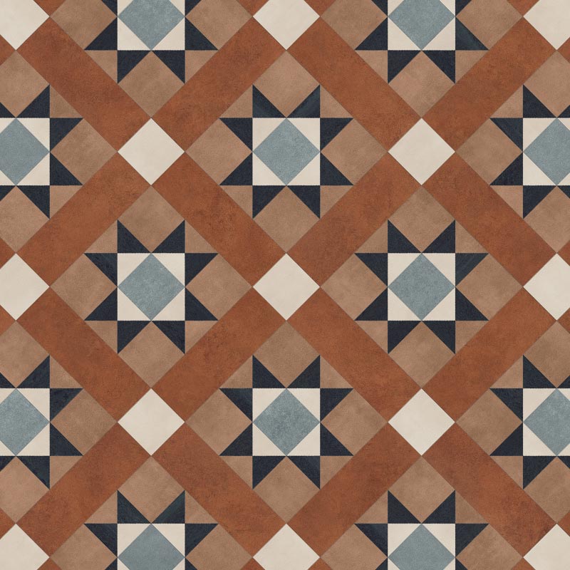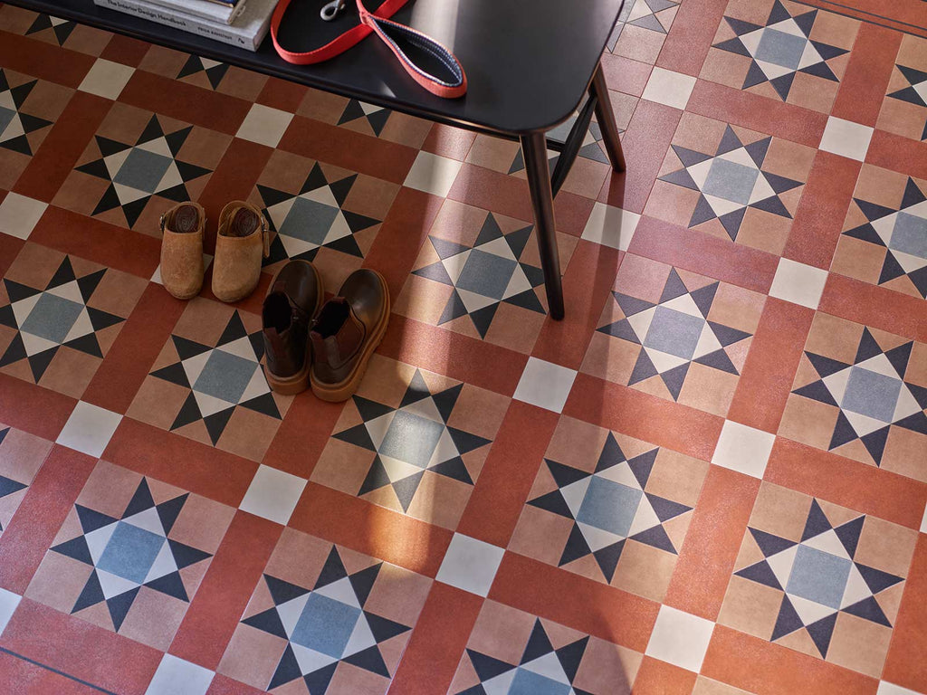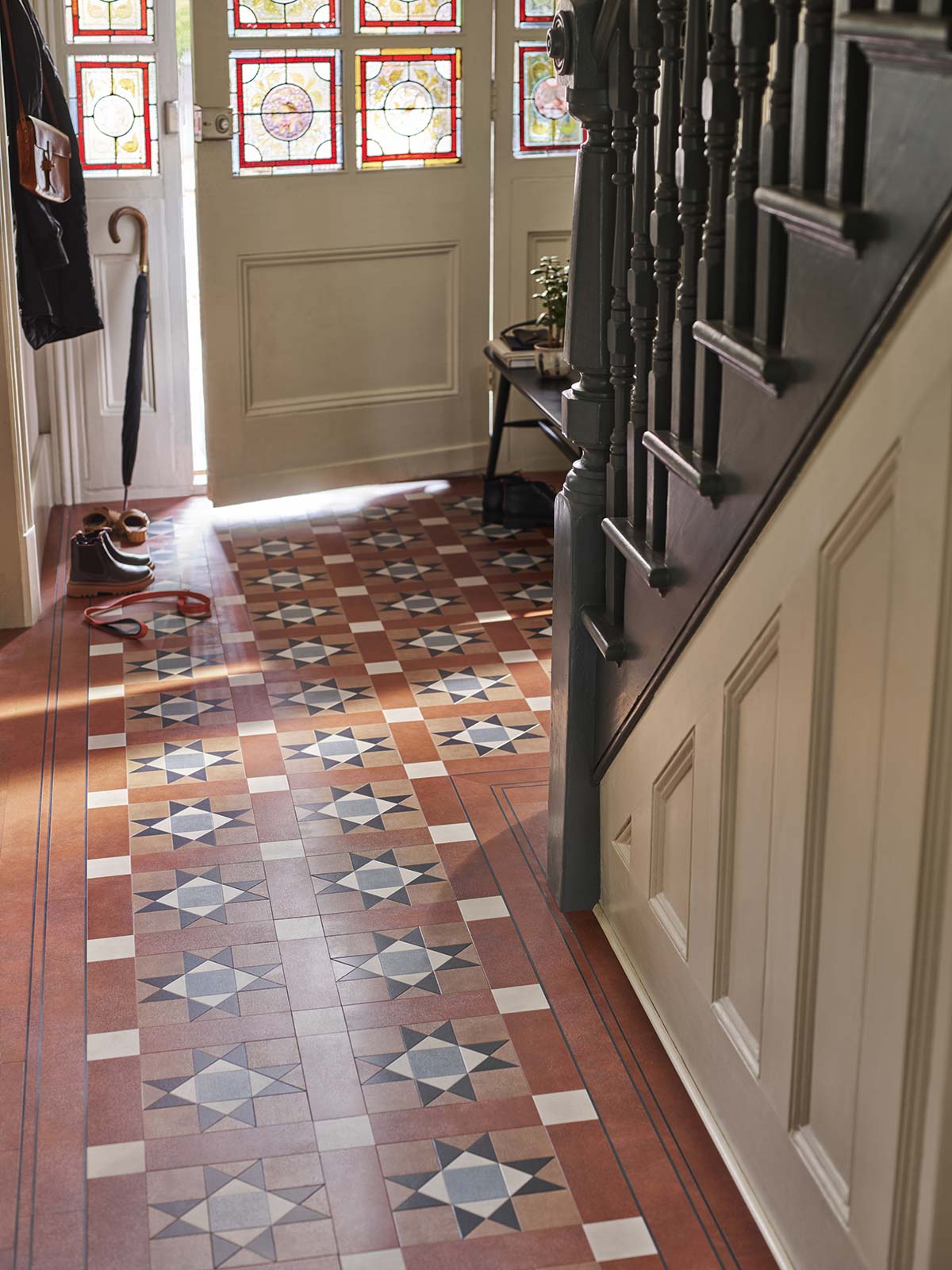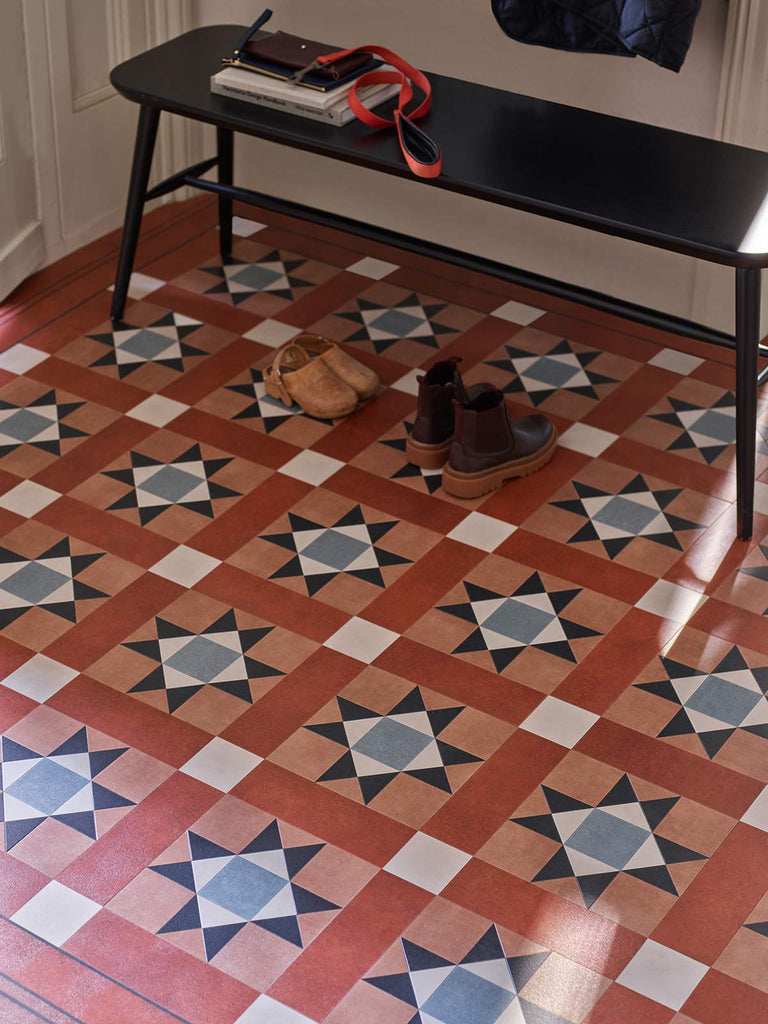 Four earthy tones interrupted by a burst of blue. This versatile flooring works equally well as a complete floor or a standout feature, and perfectly suits a traditional scheme.