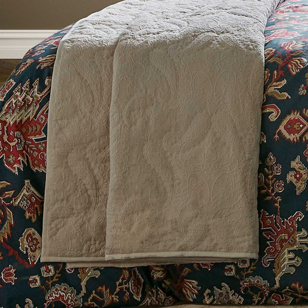 A beautiful all-over tapestry style design bedding set in tones of deep teal and tan with a contemporary striped design to the reverse. Enhance the look with the digitally printed cushion with embroidered detailing, the white square cotton sateen pillowcase with embroidered detailing and the beautifully soft matelassé quilted throw with paisley design in beige for a globally inspired look, sure to bring sophistication to your bedroom scheme.