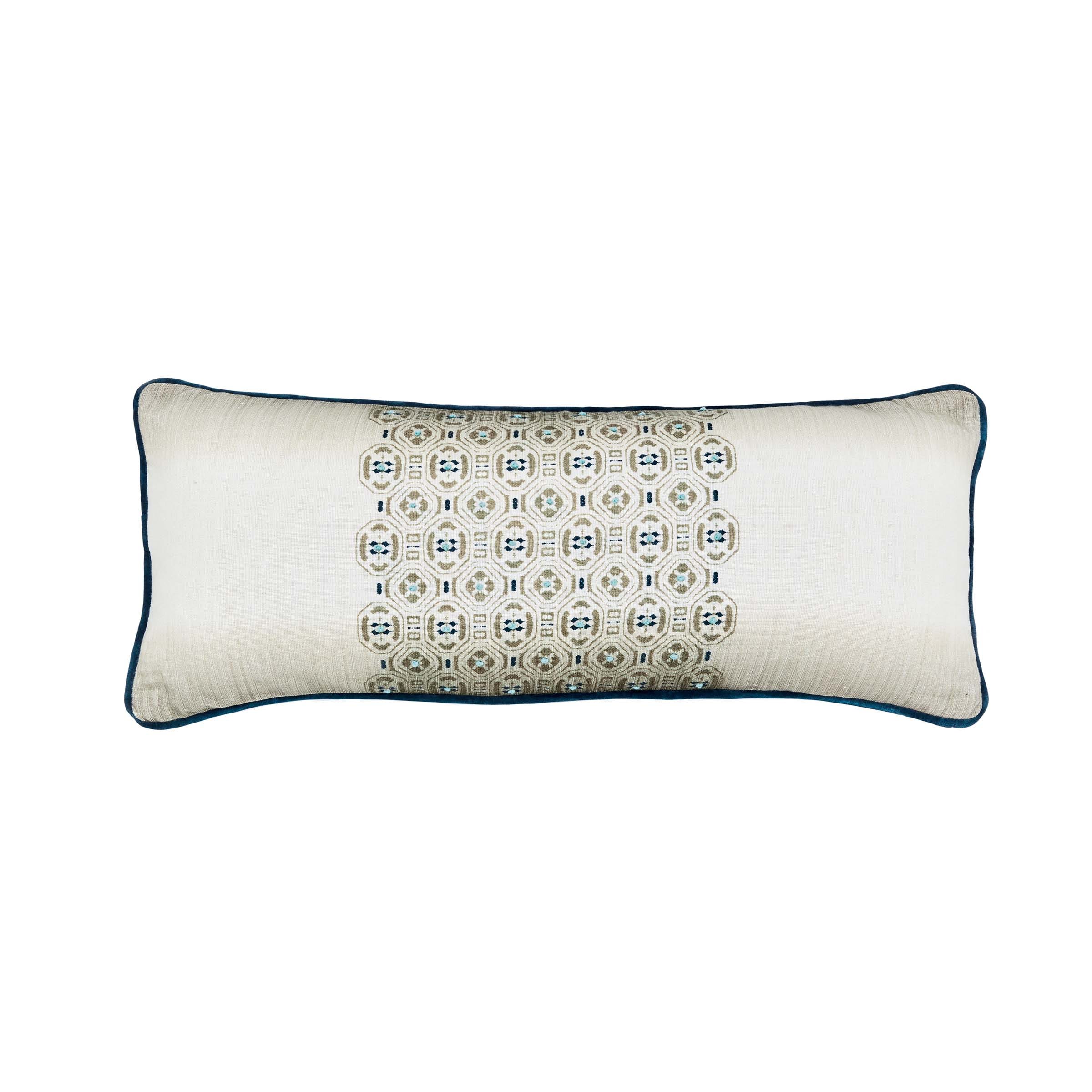 Elara presents a beautifully detailed paisley print design in shades of blue and green with a simple striped reverse. Elevated the look with the denim blue chambray quilted throw, white square pillowcase with embroidered edge framed with a blue and green line and the digitally printed ombre geometric design cushion with embroidered detail to complete the look.