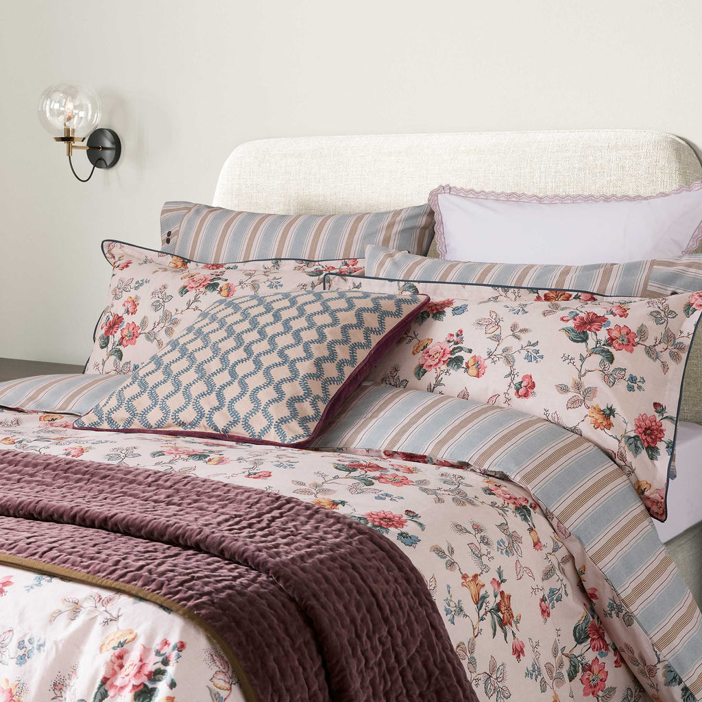 Introducing the Elinor bedding set from Bedeck of Belfast, a perfect blend of elegance and comfort. This set features a stunning vintage floral design in multi-coloured hues of pinks, blues, and linen tones, crafted from luxurious 200-thread count cotton percale. The finely striped reverse adds a touch of sophistication, while the square Oxford pillowcase with lace trim on all four sides enhances its timeless appeal. Complete the look with the hand-quilted cotton velvet throw and the coordinating embroidered cushion for a truly exquisite bedroom ensemble.