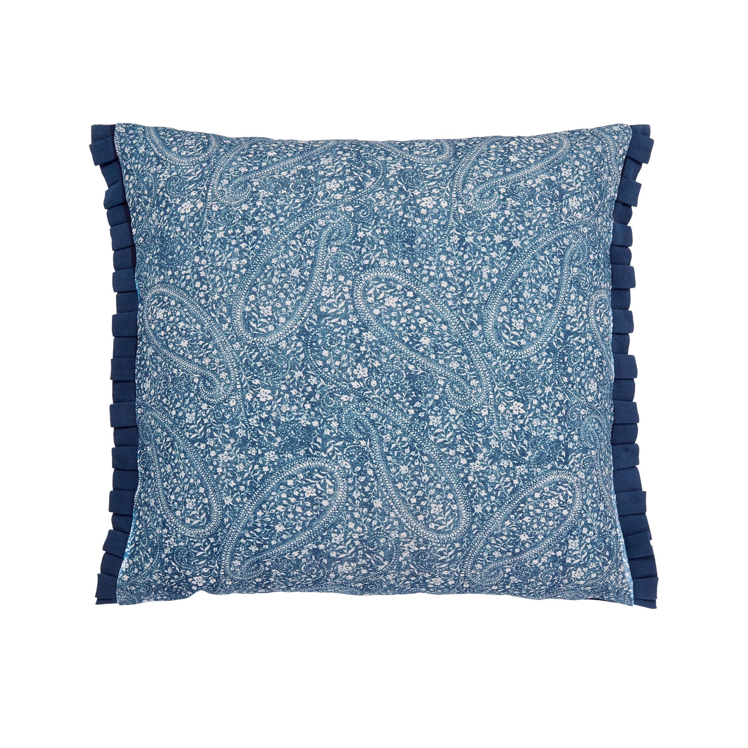 Introducing Emmeline, an exquisite bedding set showcasing a delicate vintage floral design in denim blue and pink, crafted from luxurious 200 thread count cotton percale. The square Oxford pillowcase, adorned with a linen-coloured frilled trim, adds a touch of sophistication, while the silky smooth 200 thread count cotton sateen enhances its luxurious feel. Complete the ensemble with the quilted throw in cotton chambray, featuring contrasting embroidered detailing, and the coordinating cushion with a digitally printed paisley pattern and pleats on two sides in a cotton linen mix. Transform your bedroom into a serene retreat with Emmeline.