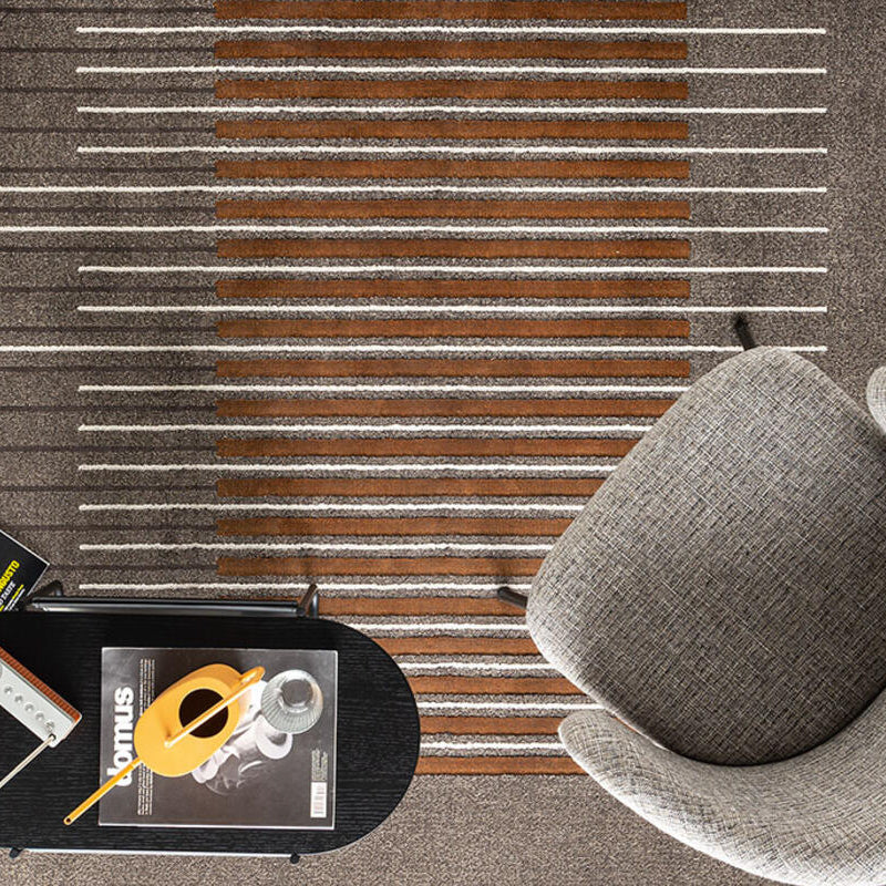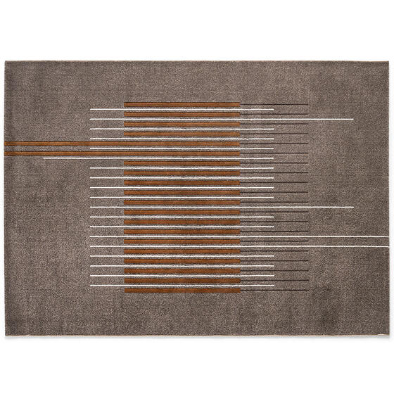 Uptown rug is akin to a picture frame, offering a modern reinterpretation of twentieth-century rationalist imagery. The striking contrast between tobacco brown and ash grey defines its bold and austere personality, while simultaneously exuding an elegant aesthetic suitable for both well-lit, open spaces and cosy, intimate atmospheres.