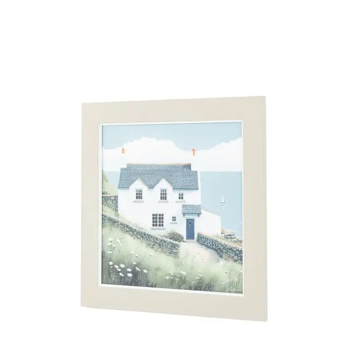 Escape to the tranquil peace of a seaside cottage with this charming print. As a picturesque cottage sits on a hilltop overlooking the calm sea, a small sailboat passes by, evoking a soothing feeling of peace. Framed in a light grey frame with a white lip.