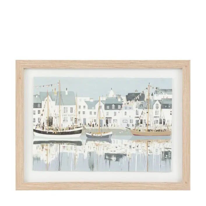 Alive with activity, this charming maritime scene brings a harbourside to life. Townspeople gather in front of a row of fishermen's cottages along the harbour wall, watching the sailboats bedecked with bunting in the water, the boats' reflections shimmering below. Framed in a simple oak effect frame.