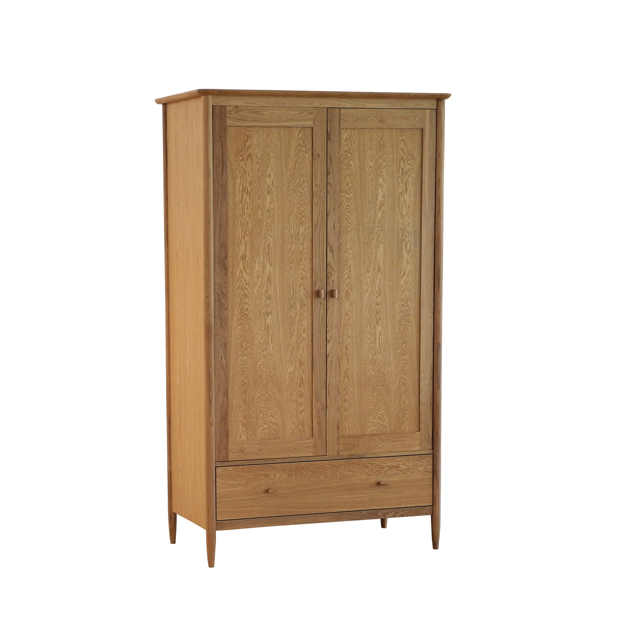 The Teramo double wardrobe offers substantial storage space. It has a large compartment with a sturdy wooden hanging rail, providing ample room to hang your clothes. A generously sized drawer sits beneath the main storage compartment offering the perfect storage solution for shirts or knitwear and the like. Double chamfered edges on the traditional oval handles create a defined and modern profile and are wonderfully tactile. This oak wardrobe is finished in a clear matt lacquer to both protect the timber and show off the beauty of the wood.