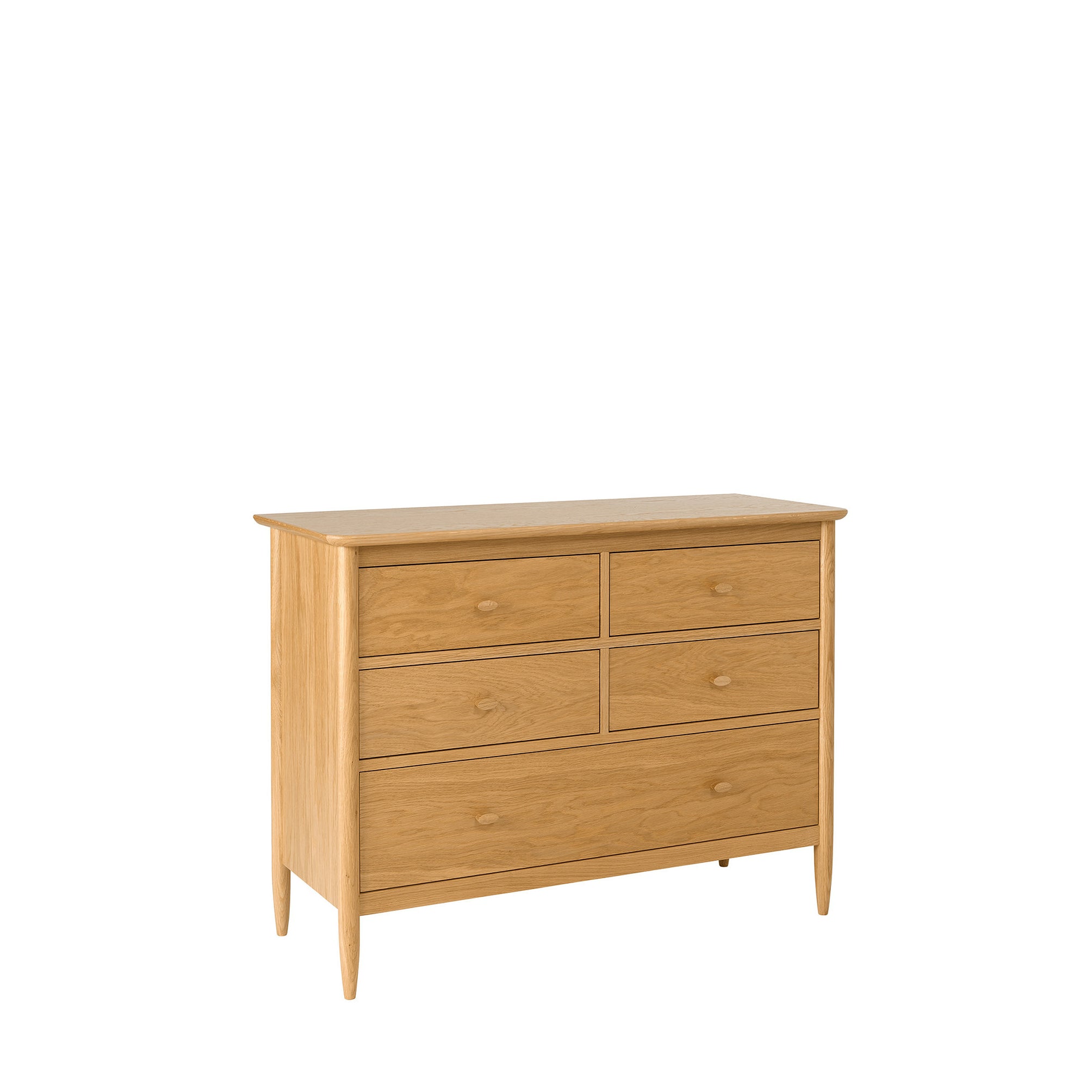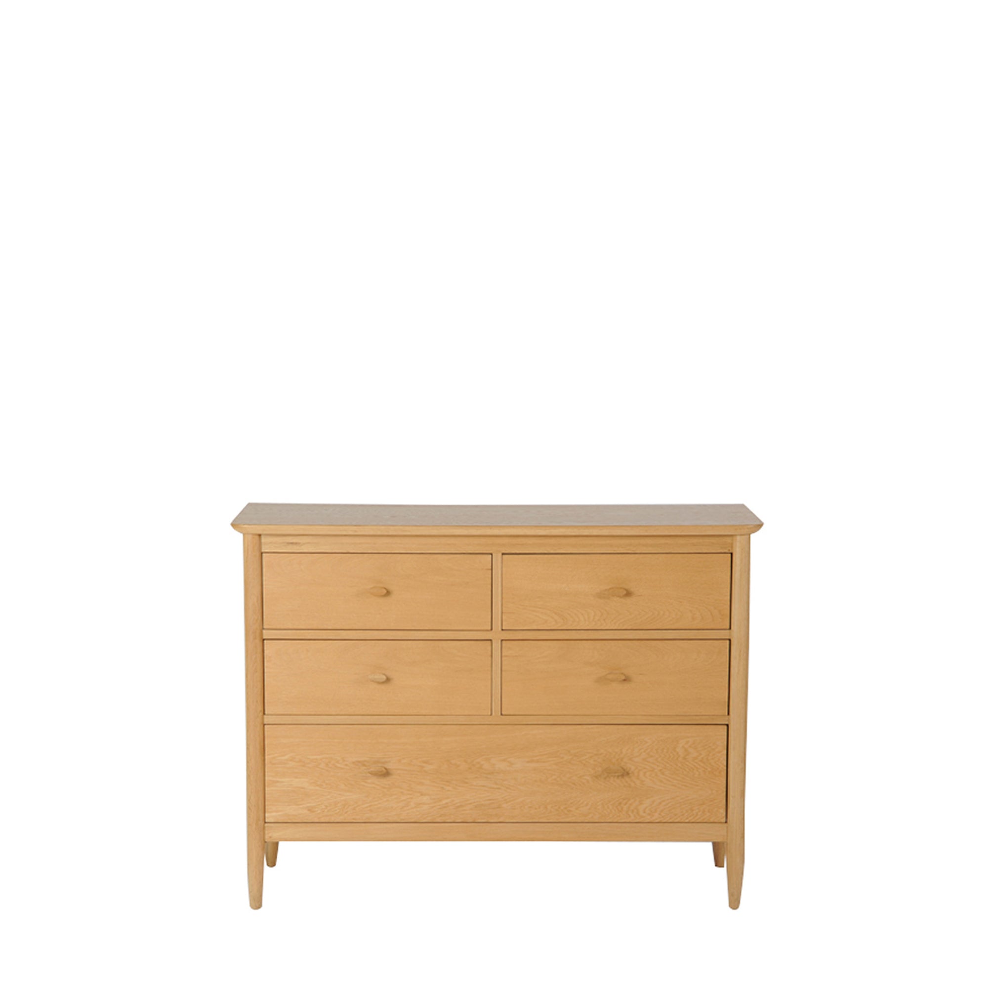The timeless shaker style design of this Teramo five drawer chest of drawers can be easily incorporated into modern or more traditional décor. This chest of drawers provides plenty of useful storage with its five deep drawers. The double chamfered edge on the traditional oval handles creates a defined and modern profile and is wonderfully tactile. Tapered turned legs and fluid curved corners on the top of the chest are characteristically Teramo and simply beautiful. This oak furniture is finished in our clear matt lacquer, providing protection whilst at the same time showing the beauty of the timber.