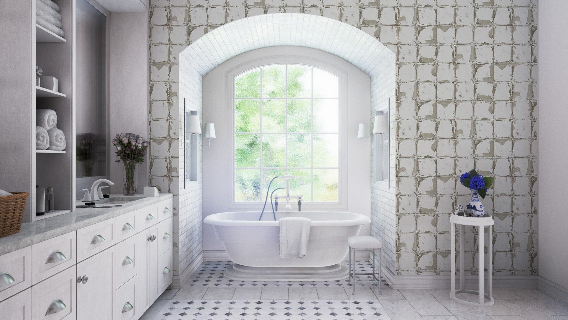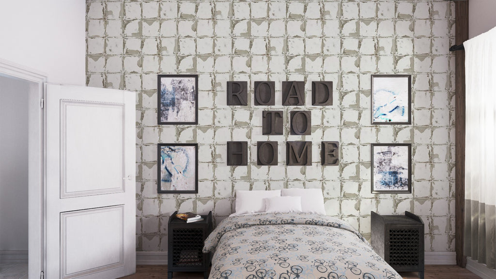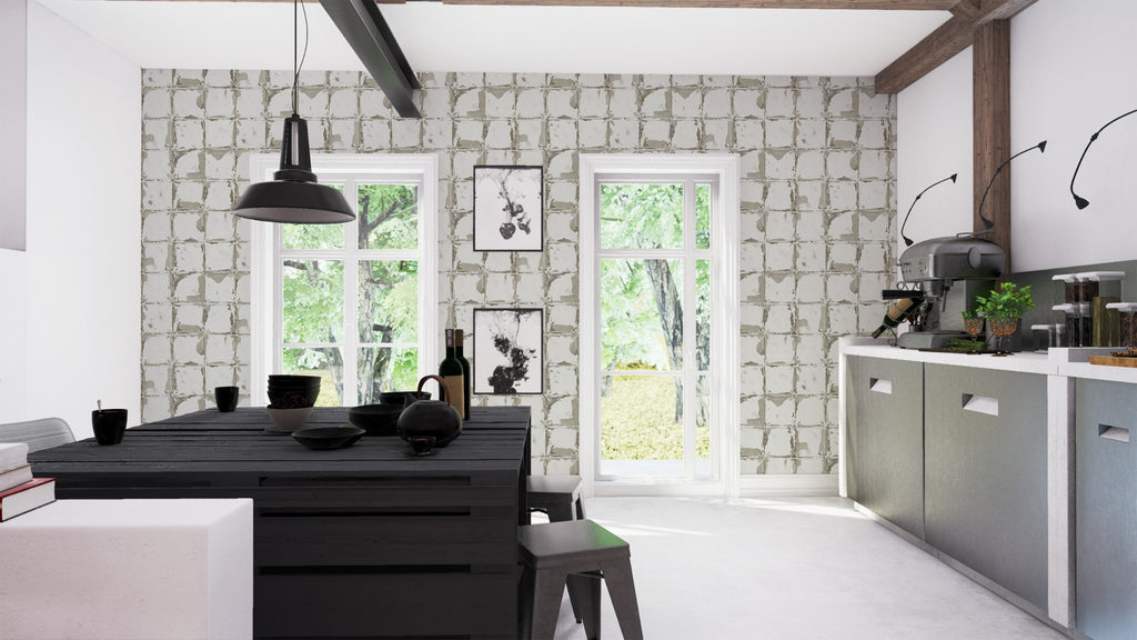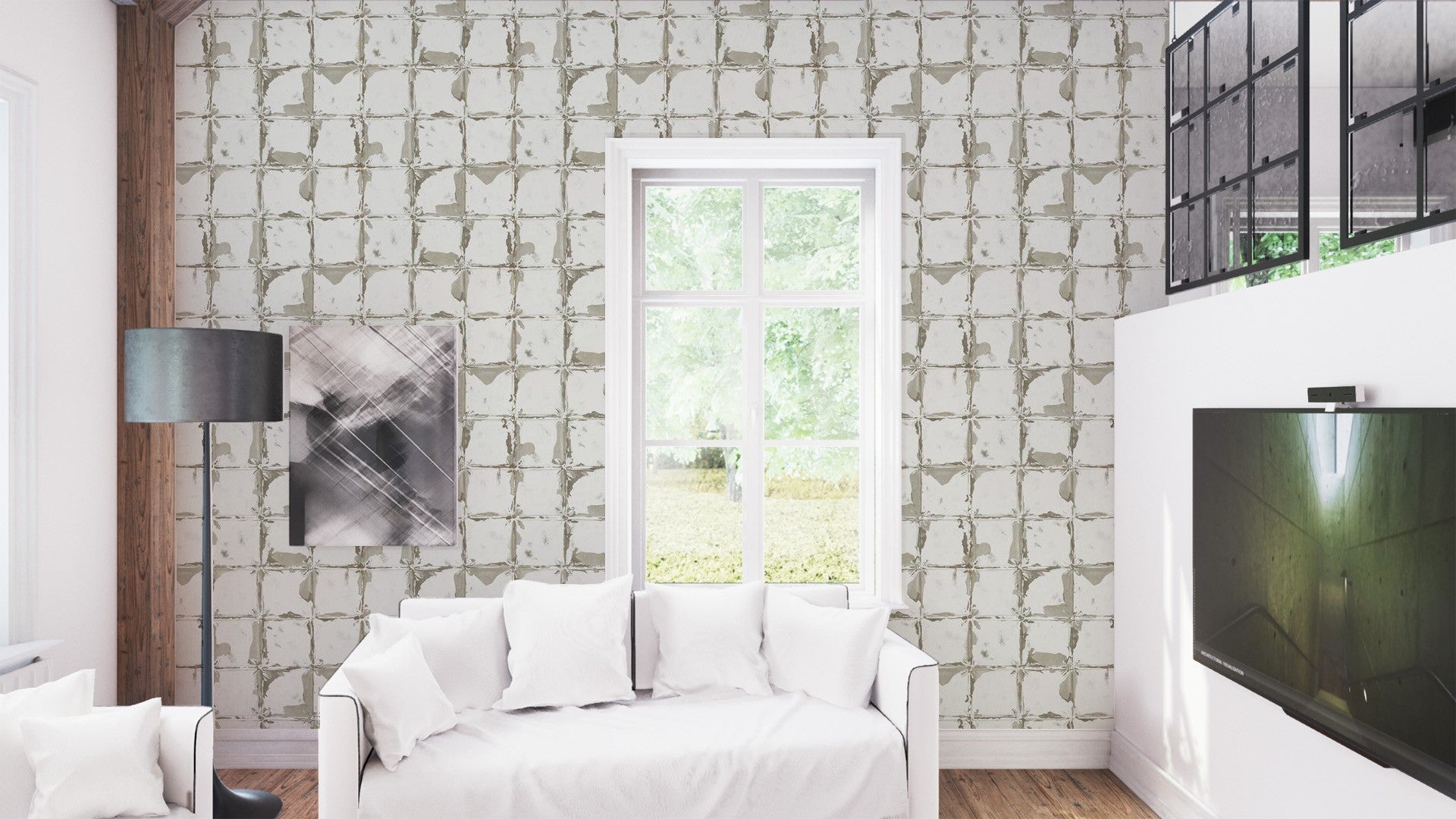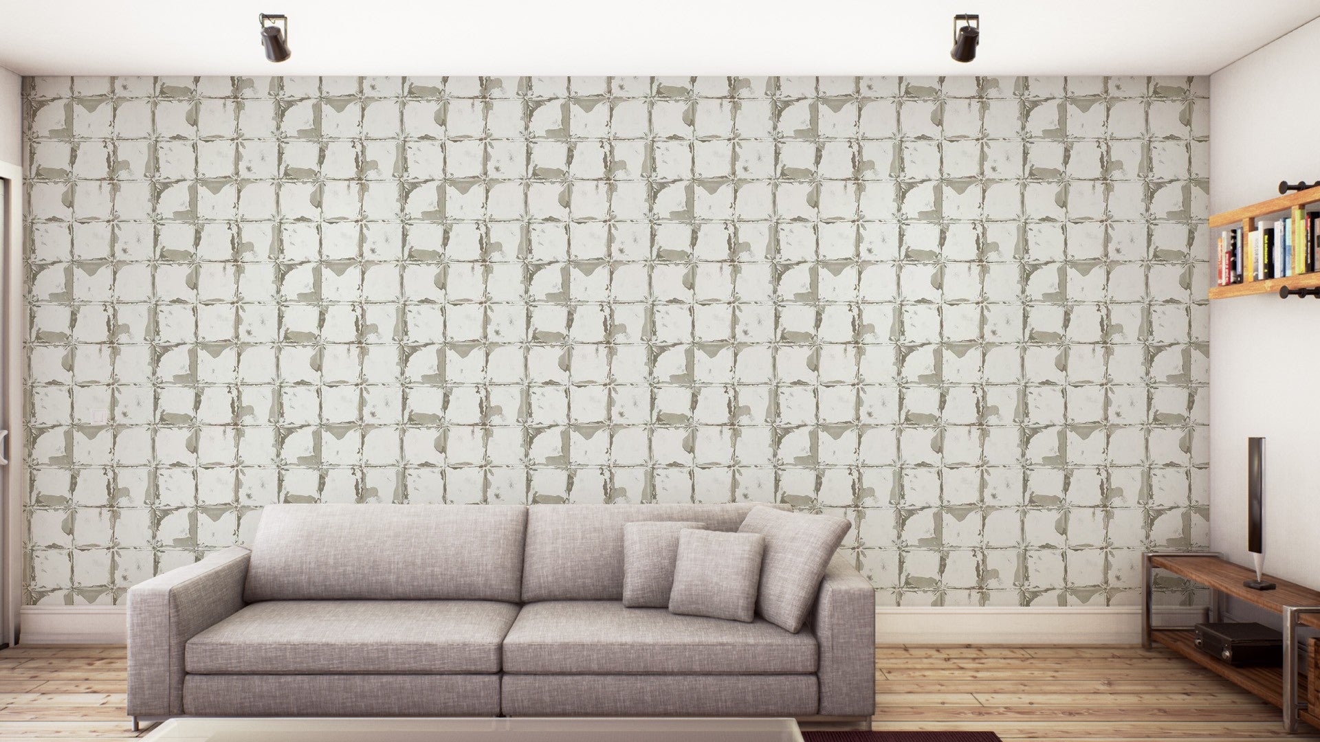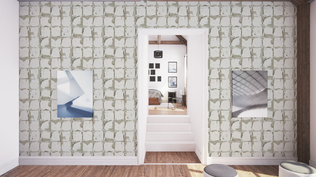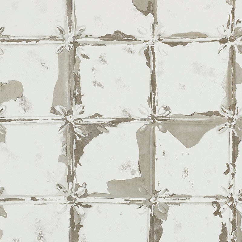 Inspired by a heavily embossed antique enameled screen, translated in trompe l’oeil fashion. It has been printed onto foil, and layered with ink in an emulsion consistency to achieve an opaque effect. The overall look is that of peeling tiles.