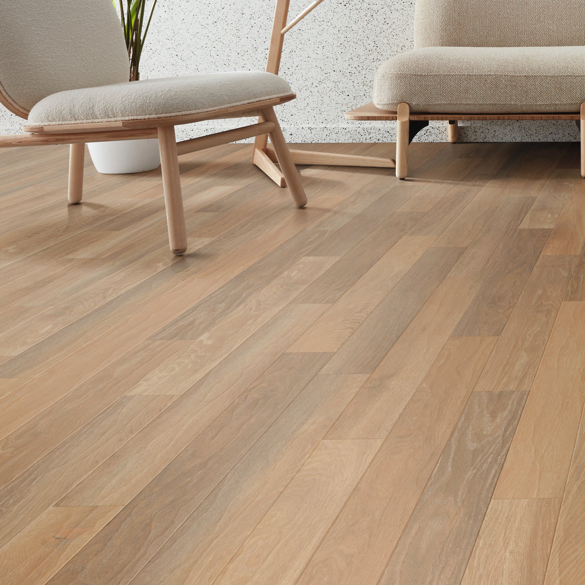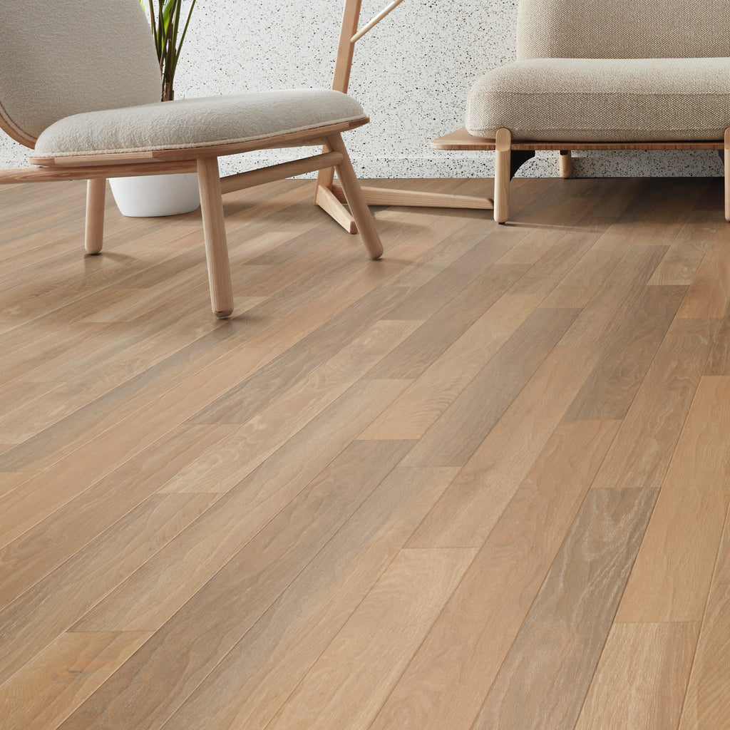 Treated with a single smoking process to enhance the smooth flowing grain texture and finished with a matte handscraped emboss, the deep golden brown colouring has a three tone effect that accentuates the natural colour variation for a classic vibe that exudes glamour.