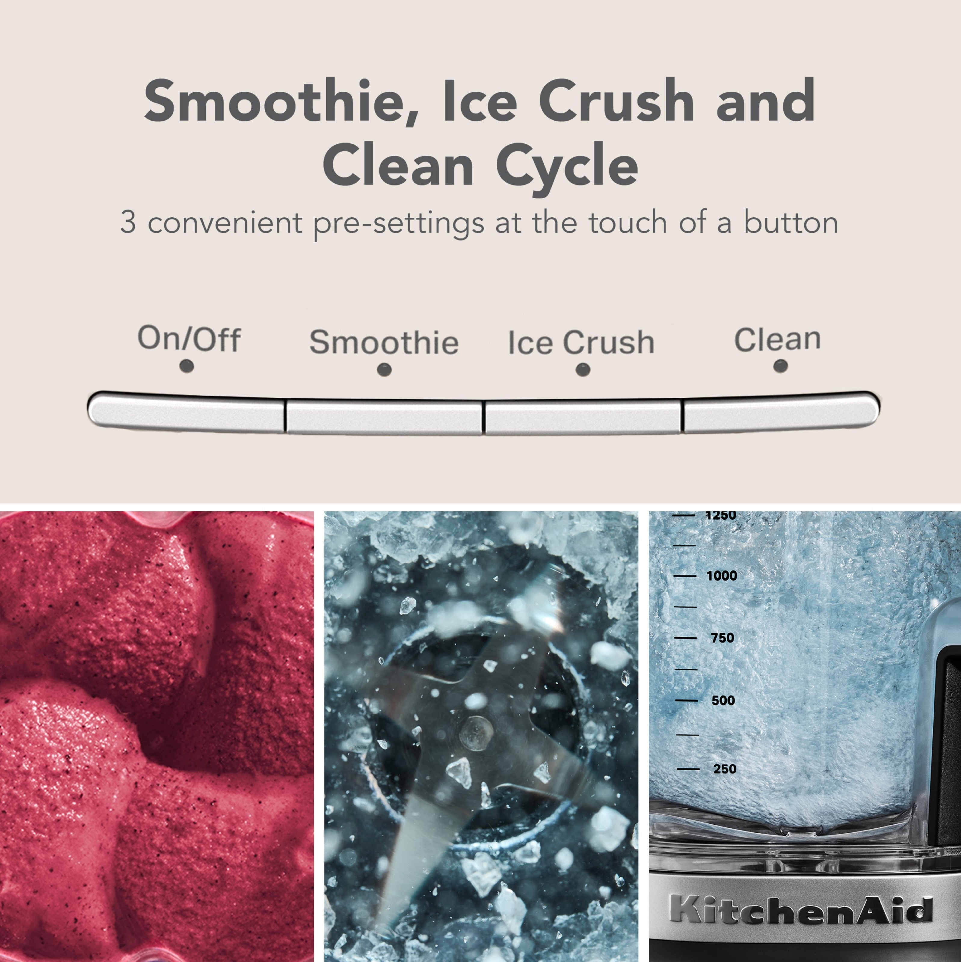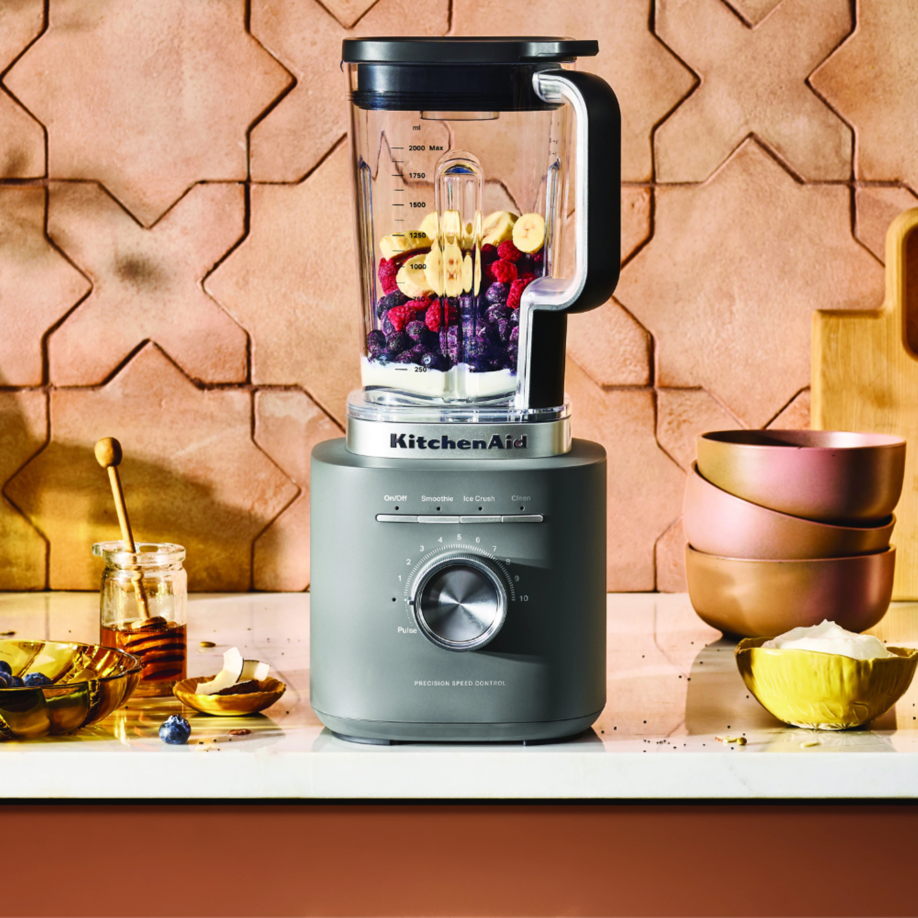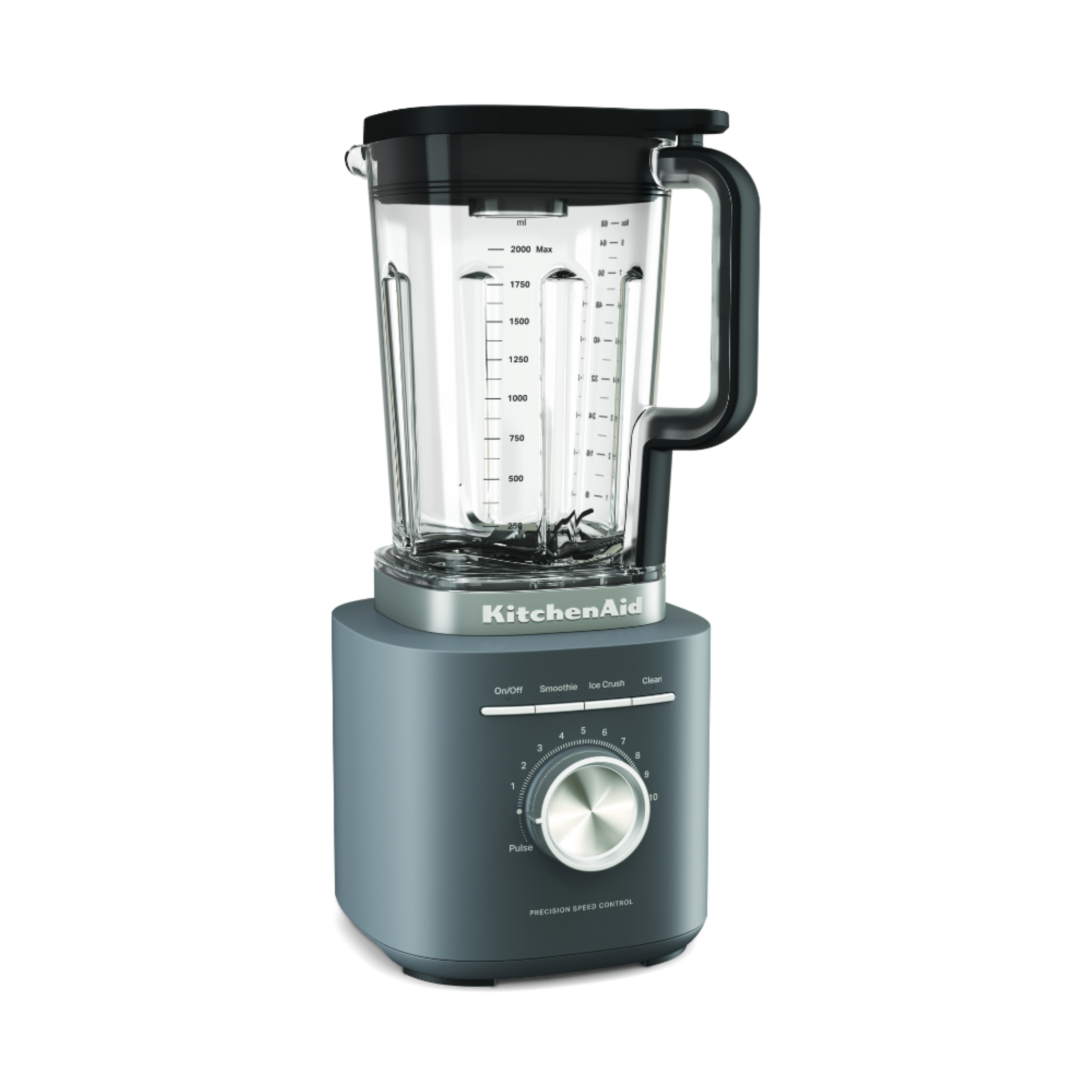 The KitchenAid Pure Power Blender helps craft the blends you want with a precision speed control knob. Use the preset 10 speeds, or twist the control knob to smoothly glide between speeds, finding the exact setting for your perfect texture. As well as the preset speeds, there are 3 presets modes: Ice Crush, Smoothie, and Clean. The blender has powerful 360 asymmetrical blades which blend at different angles to break down the toughest ingredients, including ice and frozen foods. It comes with a BPA-free plastic jar for your sweet or savoury blends. The 2 L jar has a vent in the lid, to release steam from hot ingredients, and also to allow easy adding of ingredients into the jar. (For hot liquid do not exceed 1.2L).