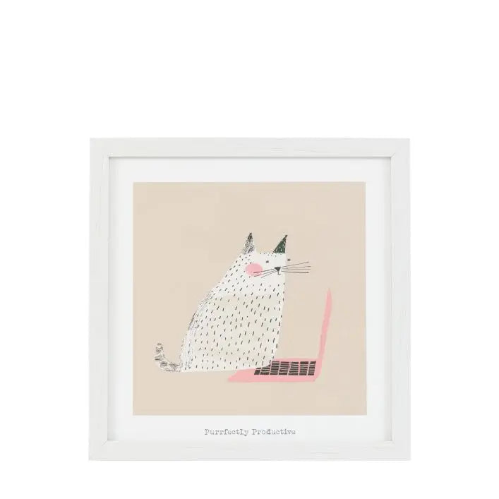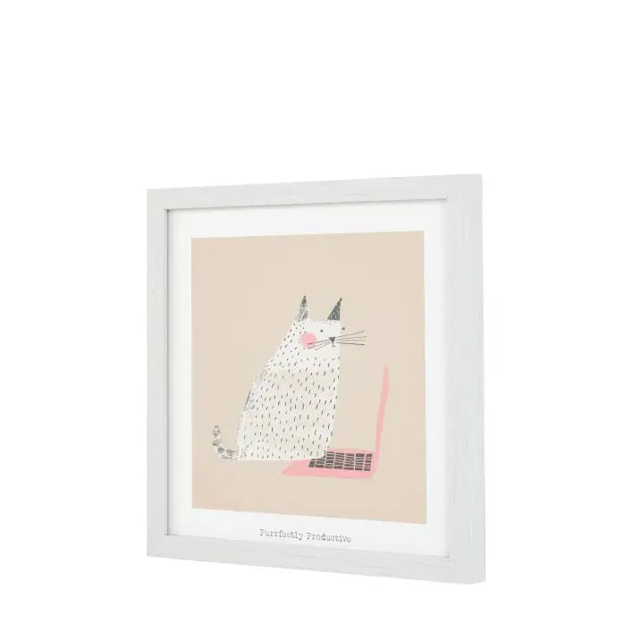 Ready to get to work, this cheeky feline sits at a laptop, prepared to join the next meeting or simply serve as a perfect distraction from the workday. This whimsical illustration in a pale palette of cream, beiges and muted pinks is a charming addition to a room. The print is complemented by a simple off white wood effect frame.