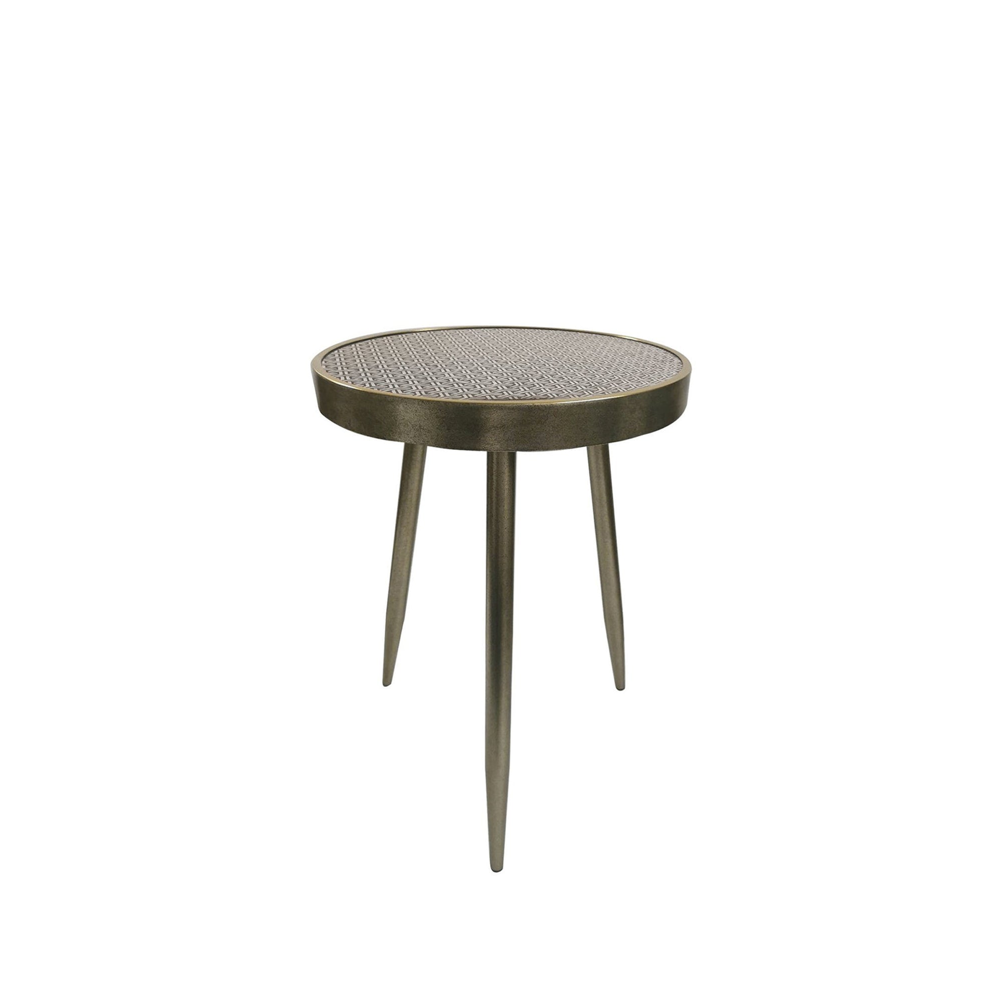 A beautiful tripod table. Sleek distressed finish with a geometric design on a mirrored top. Ideal for any room in the home or office