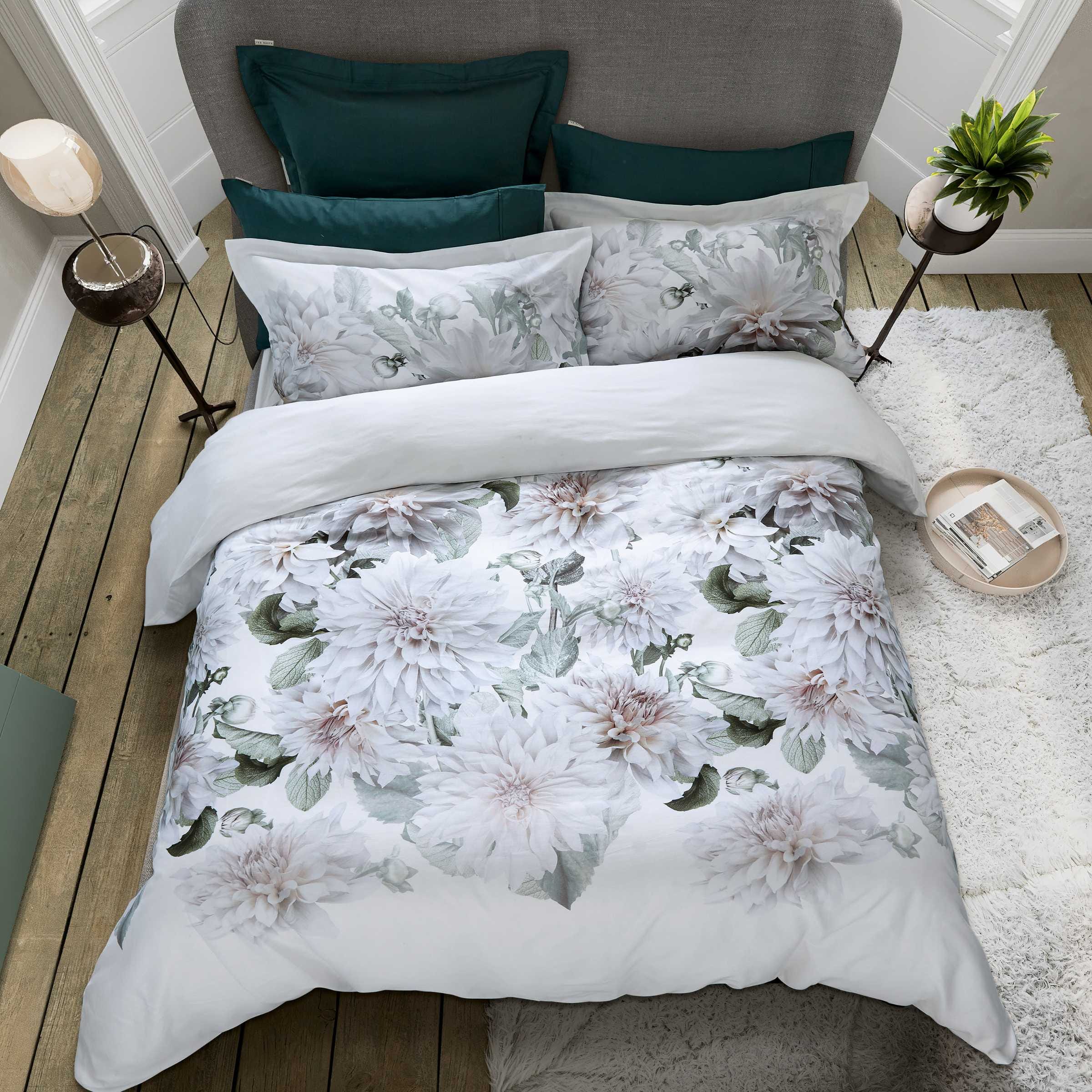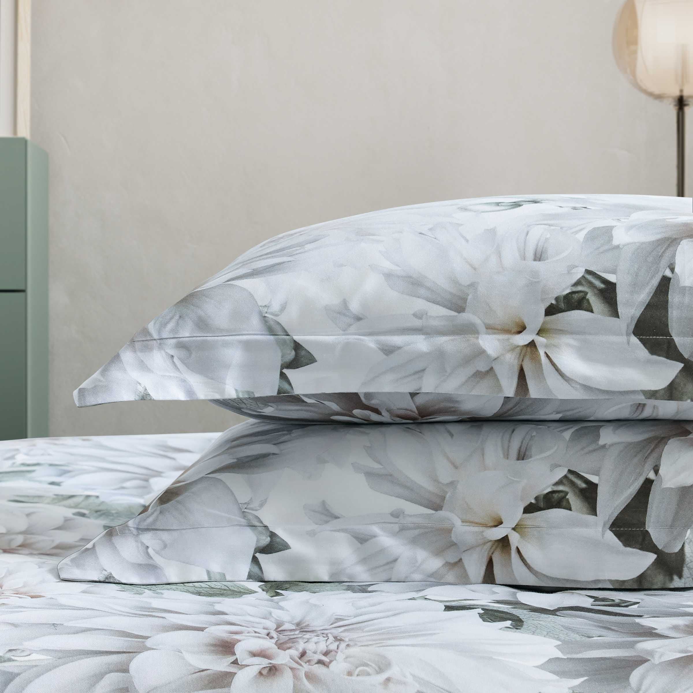 Ted Baker reinvents floral bedding for Spring 2025 with Clove Floral, a show stopping, supersize photographic flower print bursting into bloom. Colours are muted, with chalky greys, pinks and greens contrasting against a white ground.