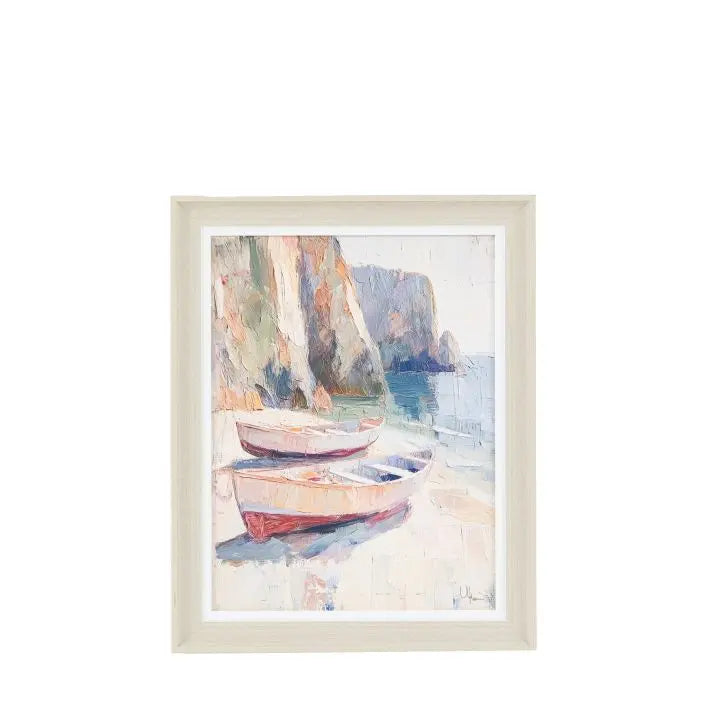 Drink in the peace and tranquillity of this print. Using textured brushstrokes and a soft palette, the artist has created this tranquil scene. Two small boats sit on the beachy shore of a sun drenched cove, overlooked by soaring cliffs and cool, blue green waters. Finished off with a pale wood effect frame with a white lip.