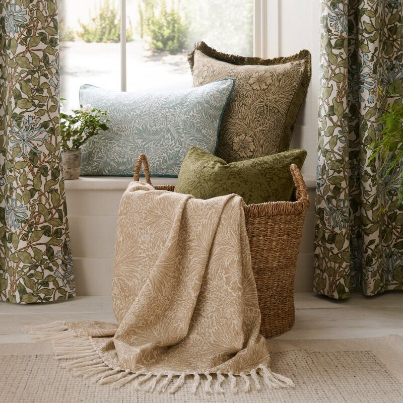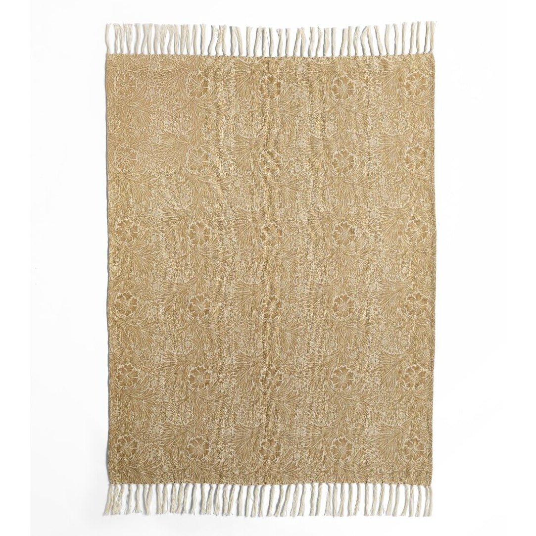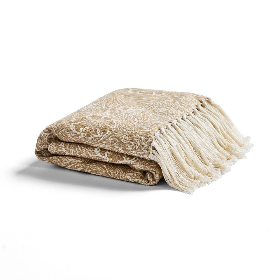 Originally registered as a wallpaper in 1875 and later as a printed cotton, the Marigold pattern is one of only three designs William Morris specifically intended to be produced as both a textile and a wallpaper. Bold marigold flowers among willow-like leaves, set against a background of smaller foliage decorate this beautiful 100% cotton throw. The iconic William Morris two-colour pattern has been printed onto a textured cotton base, in a warm natural hue and features a fringed trim finish.