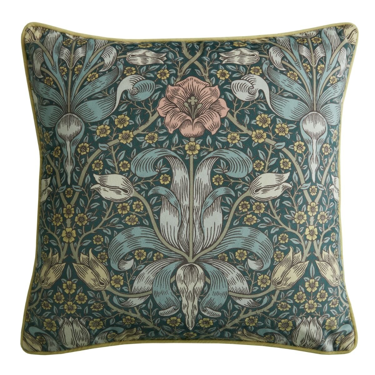Originally designed as a wallpaper by William Morris’ chief designer John Henry Dearle in 1893 and housed in the William Morris Gallery archive, the Spring Thicket design follows the same conventions as William Morris’ wallpaper ‘Lily and Pomegranate’, designed in 1886. Both patterns follow a symmetrical net repeat, with a large central clump of tulips against a background of foliage. The flowering hawthorn in this design unites the overall pattern. Recoloured in rich shades of teal, mineral, pink and soft yellows and printed onto a luxurious recycled velvet base, this reversible cushion is finished beautifully with a bright yellow piping.