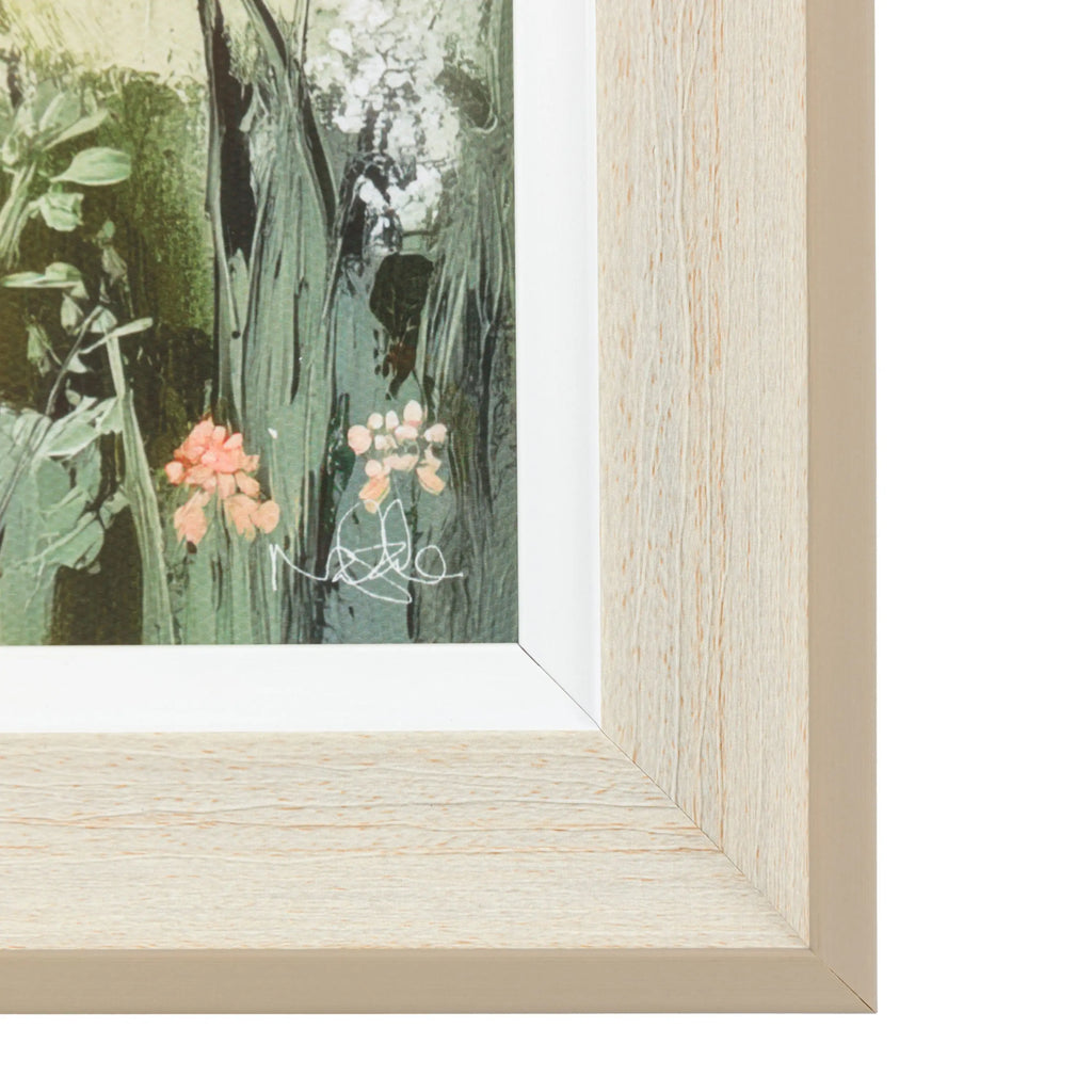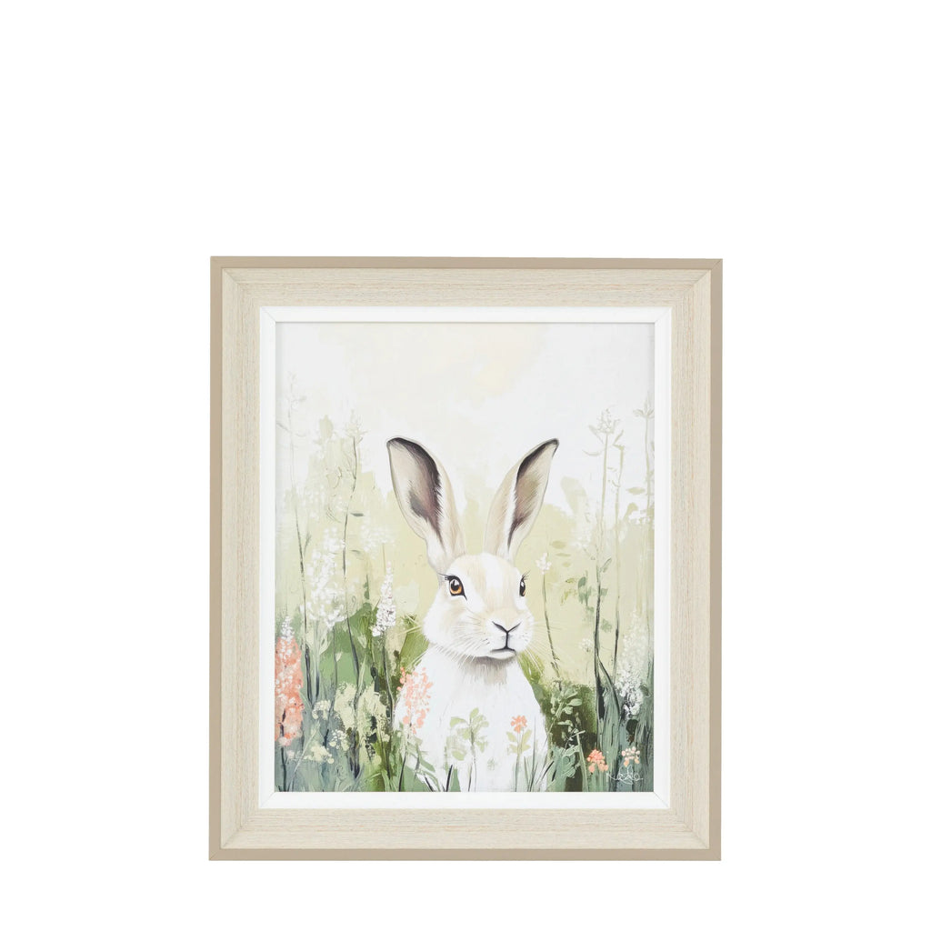 Embodying the spirit of spring, this charming high quality print is a beautiful addition to any room. A sweet little rabbit sits in a meadow, surrounded by springtime wildflowers and grasses in soft, pale tones. The print is finished off with a simple wood effect frame and white lip.